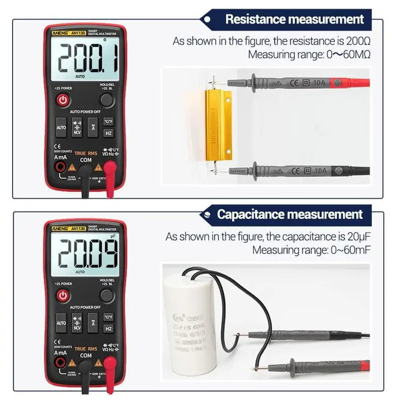 -Функции измерения включают напряжение переменного/постоянного тока, ток переменного/постоянного тока, сопротивление, диодный тест/непрерывность, NCV, частоту/рабочий цикл, испытание емкости.