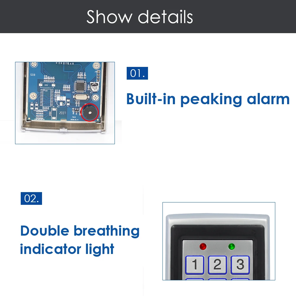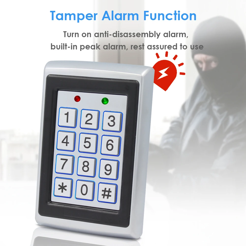Особенности: ●Прочный антивандальный чехол из цинкового сплава с гальваническим покрытием. ●Полное Программирование с клавиатуры ● 2000 использований, поддержка карт, PIN-кодов, карт + PIN-кодов. ● Может использоваться как отдельная клавиатура. ●Клавиши подсветки. ●Wiegand 26 вход для подключения к внешнему считывателю. ●Wiegand 26 выход для подключения к контроллеру. ●Регулируемое время выхода двери, время будильника, время открытия двери. ●Очень низкое энергопотребление (30 мА). ●Высокая скорость работы, <20 мс с 2000 пользователями. ●Блокировка выходного тока защита от короткого замыкания. ● Простота установки и программирования. ●Встроенный светозависимый резистор (LDR) для защиты от вскрытия. ●Встроенный зуммер