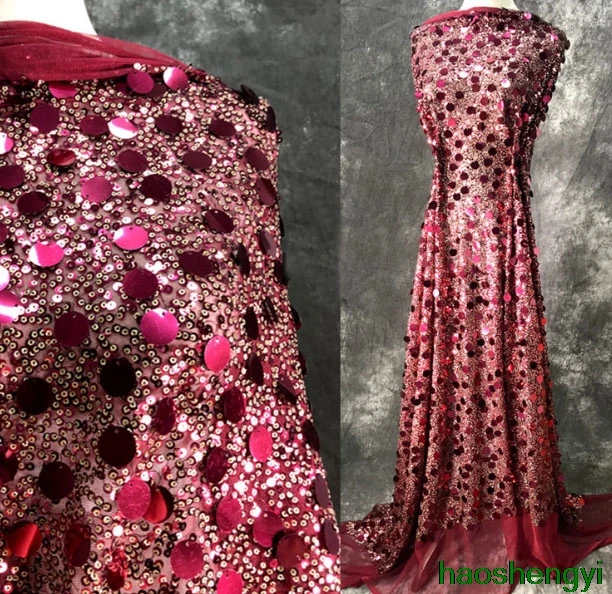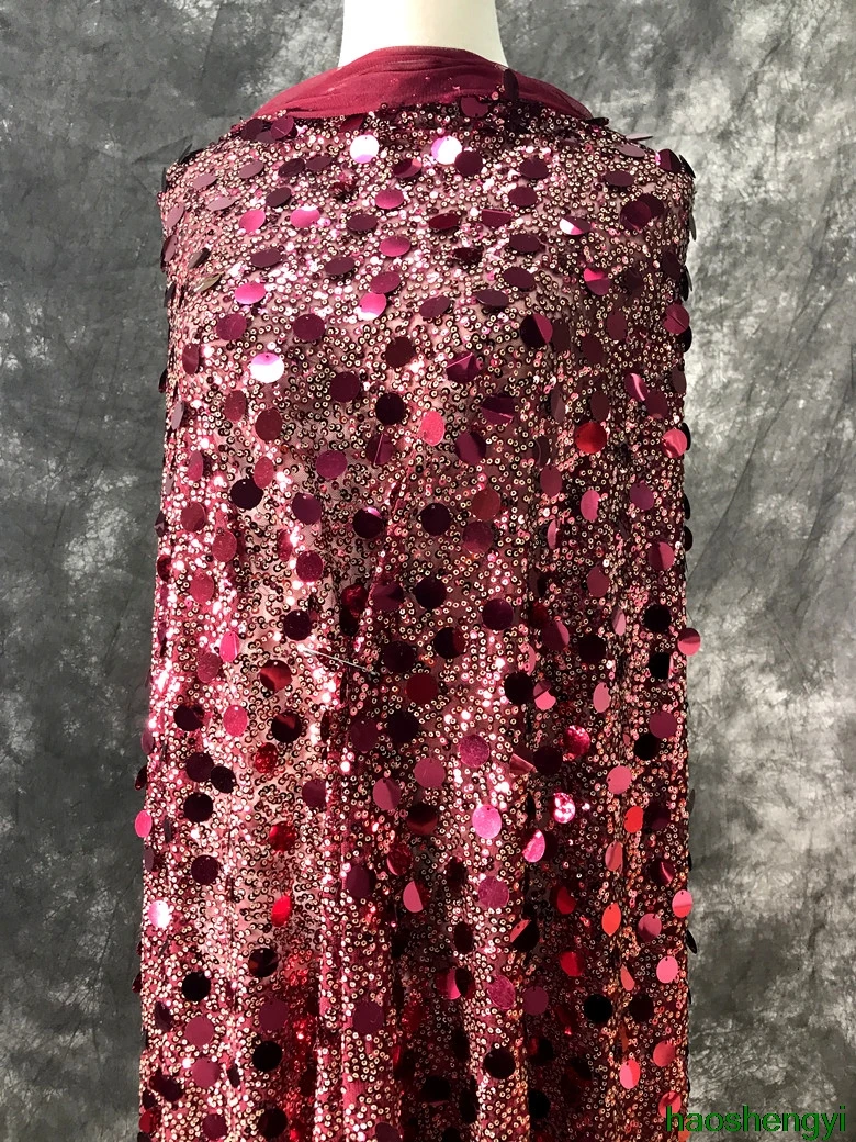 Бордовая масляная цветная ткань в горошек с блестящими пайетками в этническом стиле