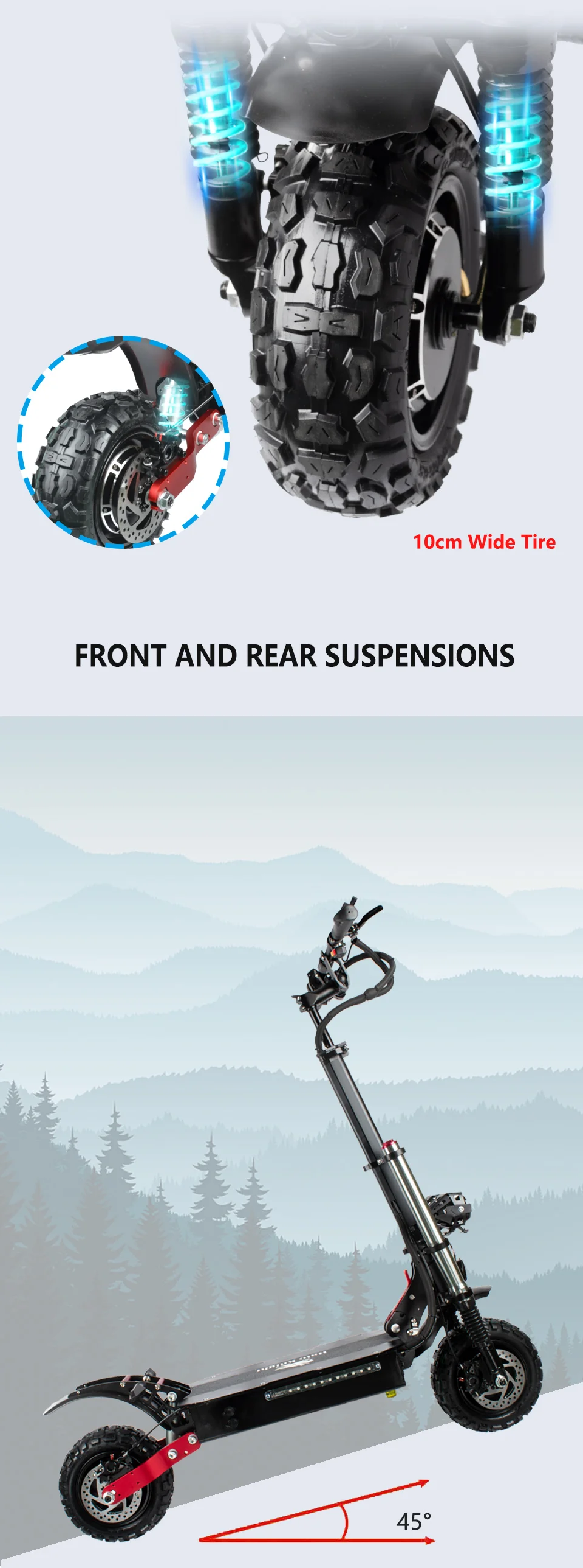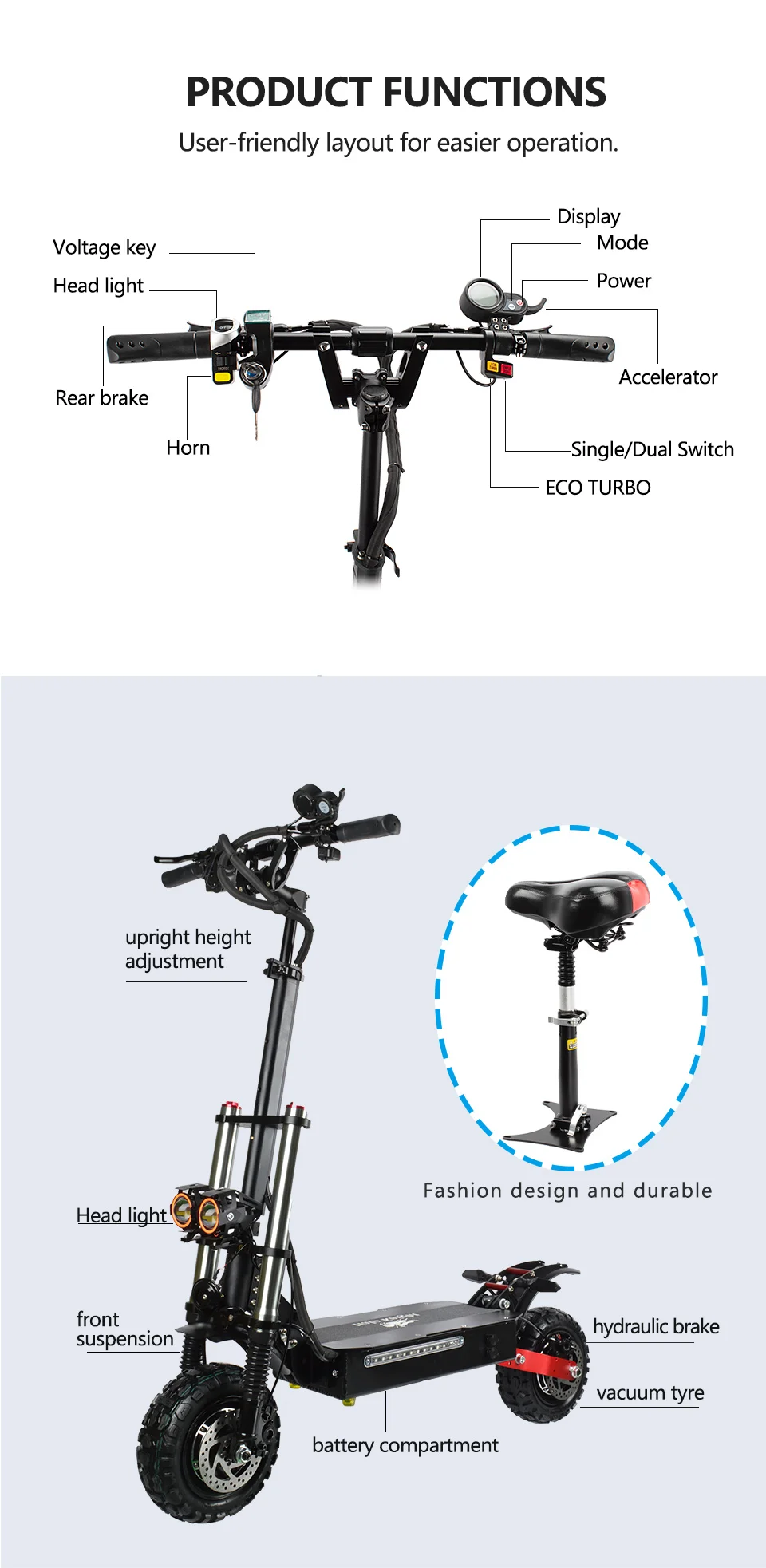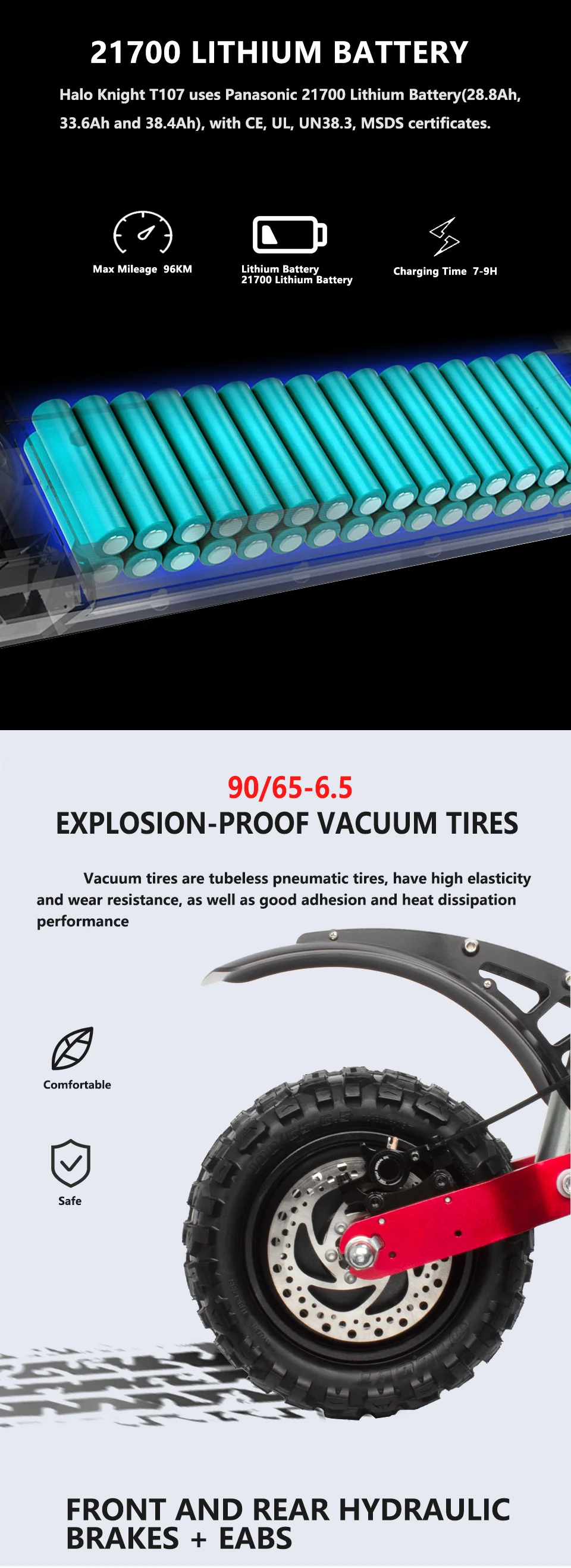 FQA 1. В: какая особенность продукта у Halo Knight T107? О: T107-это двойной привод 60 в, с двигателем HM 60 в 2800 Вт (магнит 45 мм), контроллером JP 37A, батареей 21700 28.8 Ач/33.6Ah/38.4Ah, передние и задние амортизацией, очень стабильный, Не трясите на высокой скорости с легкостью, яркий регулируемый угол глаза, клаксон мотоцикла, задний тормоз светильник, бортовой светильник s, указатели поворота, бесшовный руль из Германии. 2. В: какой тормоз используется T107? О: передний и задний гидравлический тормоз с EABS. 3. В: какую шину использует T107? О: 11 дюймовые внедорожные вакуумные шины. 4. В: Каковы производительности T107? О: скорость может достигать 85 км/ч, пробегать около 96 км при одной зарядке. 5. В: нужно ли клиенту оплачивать дополнительные налоги или пошлины на скутеры? О: покупателям не нужно платить дополнительные налоги или пошлины, потому что налоги оплачиваются с нашей стороны. 6. В: Как долго будет идти скутер? О: если заказ из Китая, он займет около 32-42 дней на поезде или по морю. Если вы сделаете заказ со склада в ЕС, доставка займет около 3-7 рабочих дней. 7. В: Могу ли я получить все запасные части T107 в магазине? О: Да, мы являемся прямым производителем, все запасные части наших скутеров доступны, даже небольшие винты. 8. В: Могу ли я стать вашим дистрибьютором или я могу сделать OEM/ODM для изготовления скутеров на заказ с моим логотипом? О: Конечно, мы специализируемся на скутерах 8-11 дюймов более 8 лет, OEM/ODM доступны, приглашаем стать одним из наших дистрибьюторов. 9. В: есть ли гарантия на ваши скутеры? О: Да, гарантия 6 месяцев на аккумулятор, 12 месяцев на другие запасные части. Если скутеры повреждены во время транспортировки или возникли проблемы после прибытия, из Китая будут отправлены Бесплатные аксессуары, а Доставка осуществляется продавцом. Если запасные части сломаны в течение 12 месяцев или батарея разбита в течение 6 месяцев, Бесплатные аксессуары будут отправлены из Китая, а транспортировка будет осуществляться с помощью клиентов. Ущерб, причиненный человеком, и поступившая вода, не покрываются гарантией. Как правило, наши скутеры подходят в течение одного года, так как перед отправкой производится строгая проверка качества, чтобы убедиться, что каждый скутер идеально подходит. 10. В: есть ли скидки на покупку T107 сейчас? О: Да, сейчас на T107 есть скидка 38% и купоны. Если вас это интересует, просто возьмите.