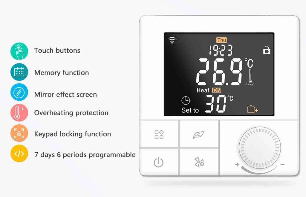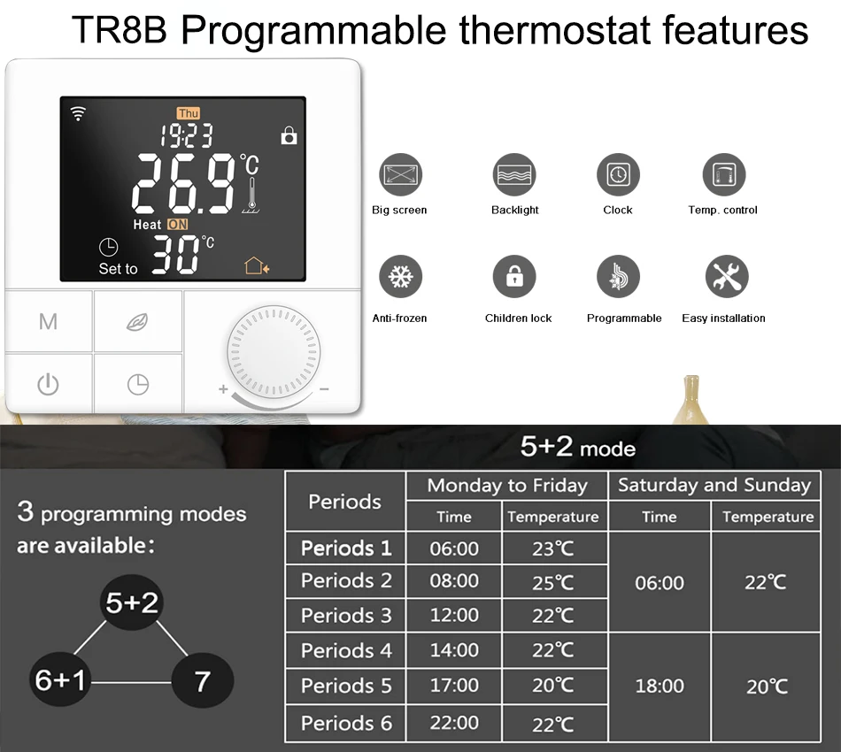 3. 5 + 2 программируемых: поддерживает полные автоматические программы или ручную настройку 5 + 2 дневного недельного расписания по 6 этапов ежедневно, обеспечивая вам максимальное удобство и комфорт. Память данных при отключении питания.
