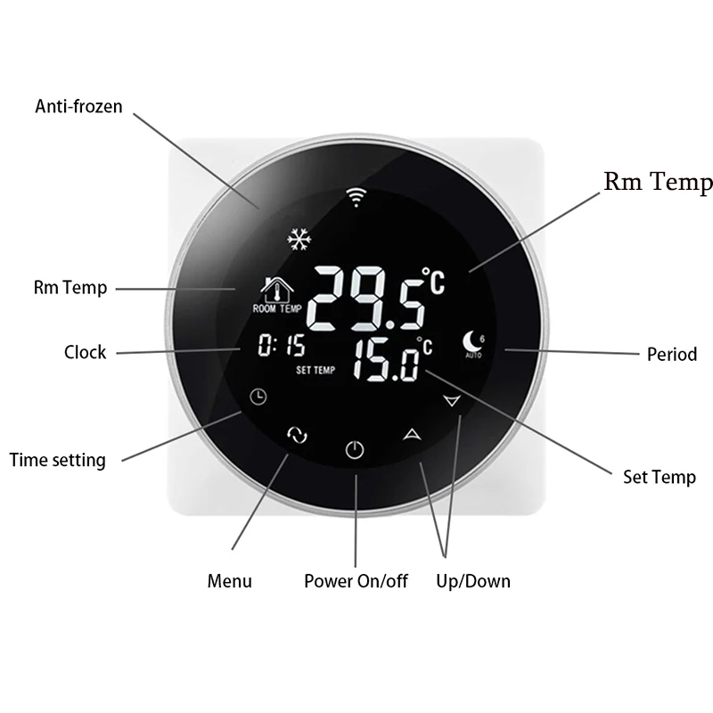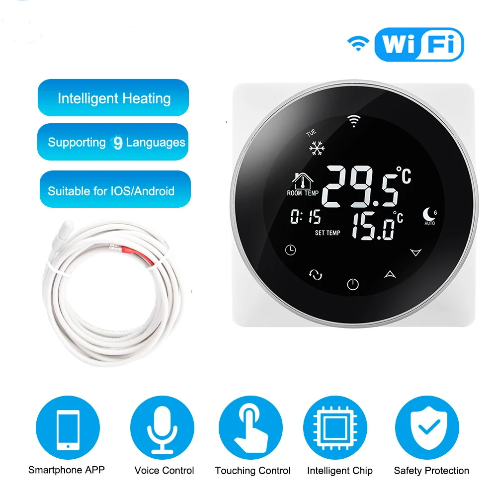 -Функция дистанционного управления Wi-Fi, Управляйте температурой вашей комнаты из любого места. -Большой сенсорный ЖК-дисплей с подсветкой -7/6 + 1/5 + 2 режима времени -6 период ежедневные программируемая настройка температуры температура воздуха -Функция защиты от замерзания -Внутренние и внешние температурные датчики на выбор -Функция блокировки клавиатуры для предотвращения неправильной эксплуатации детьми -Материал сопротивления раме, безопасный и надежный -Точность дисплея комнатной температуры составляет ± 0,5 -Функция памяти при сбое питания защищает ваши настройки от сбоя питания -Функция автоматической калибровки комнатной температуры