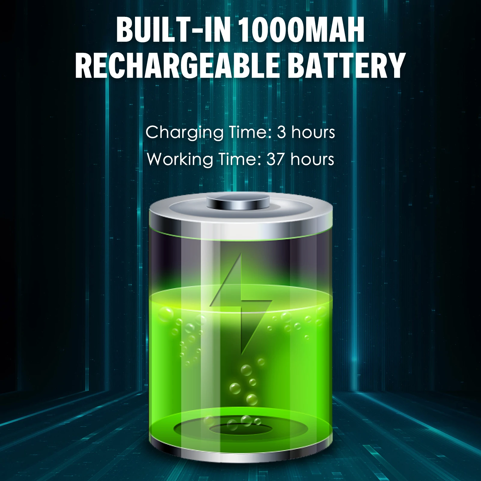 Встроенный перезаряжаемый литиевый аккумулятор емкостью 1000 мАч, срок службы около 37 часов после 3 часов полной зарядки.