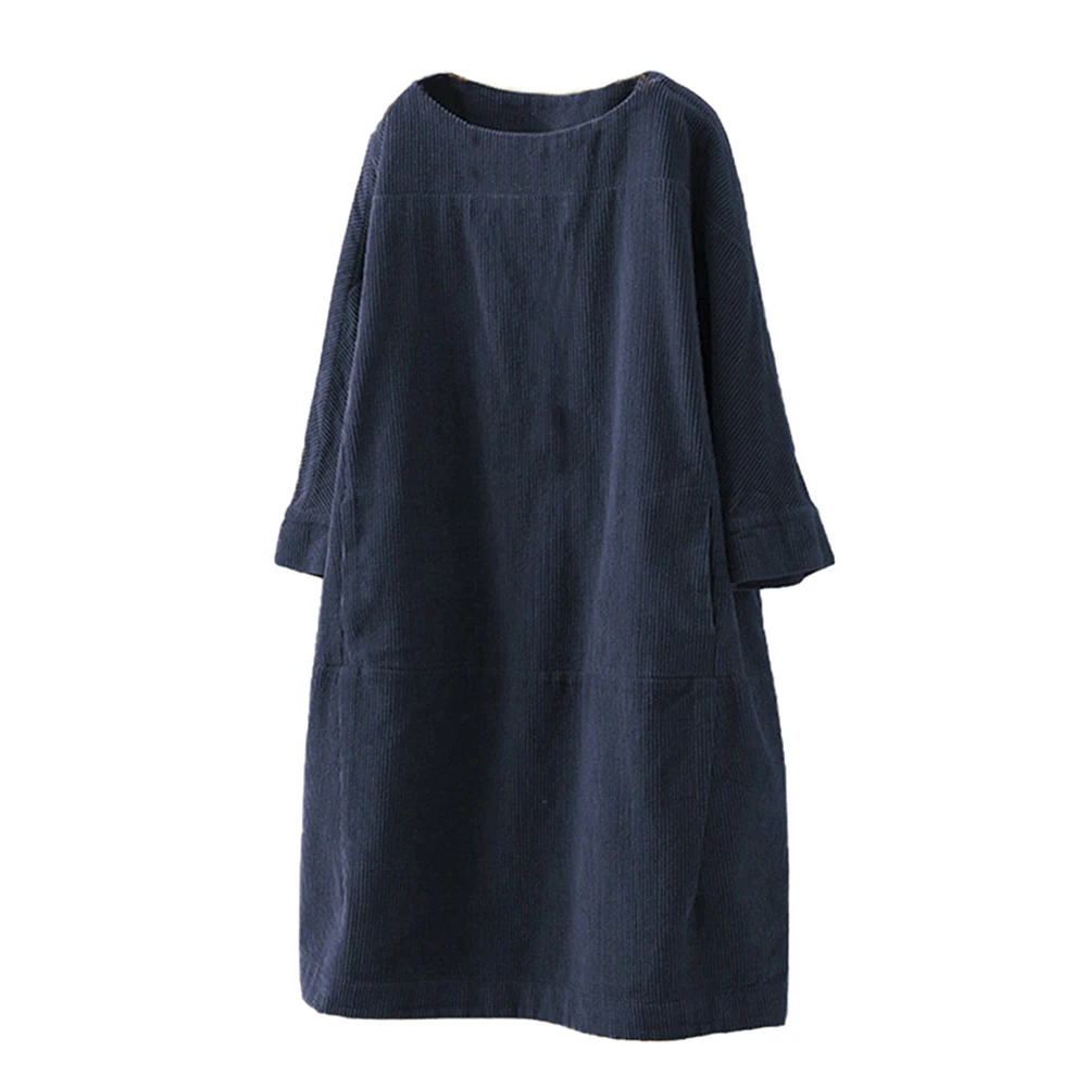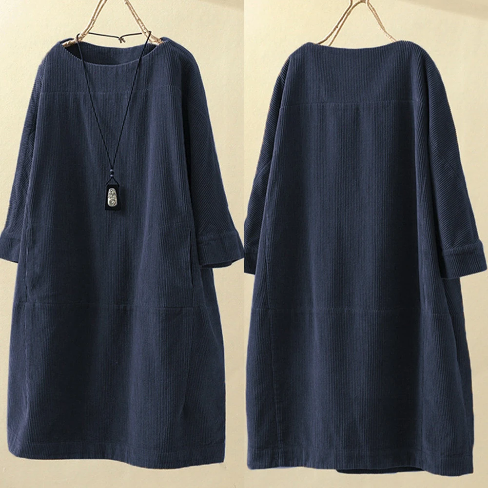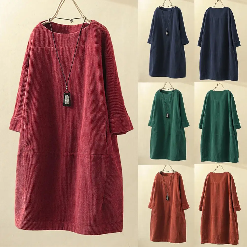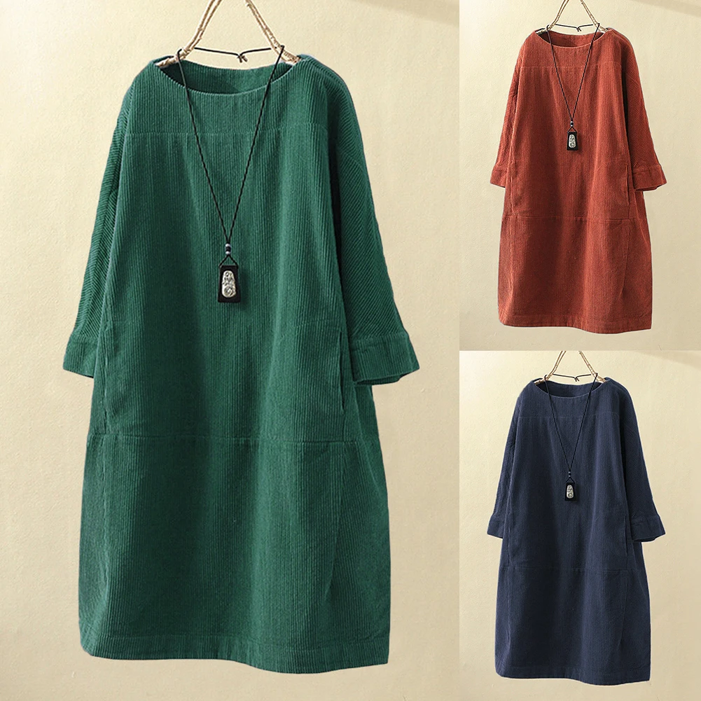 Женское однотонное вельветовое платье миди с длинными рукавами и круглым вырезом и карманами размера плюс