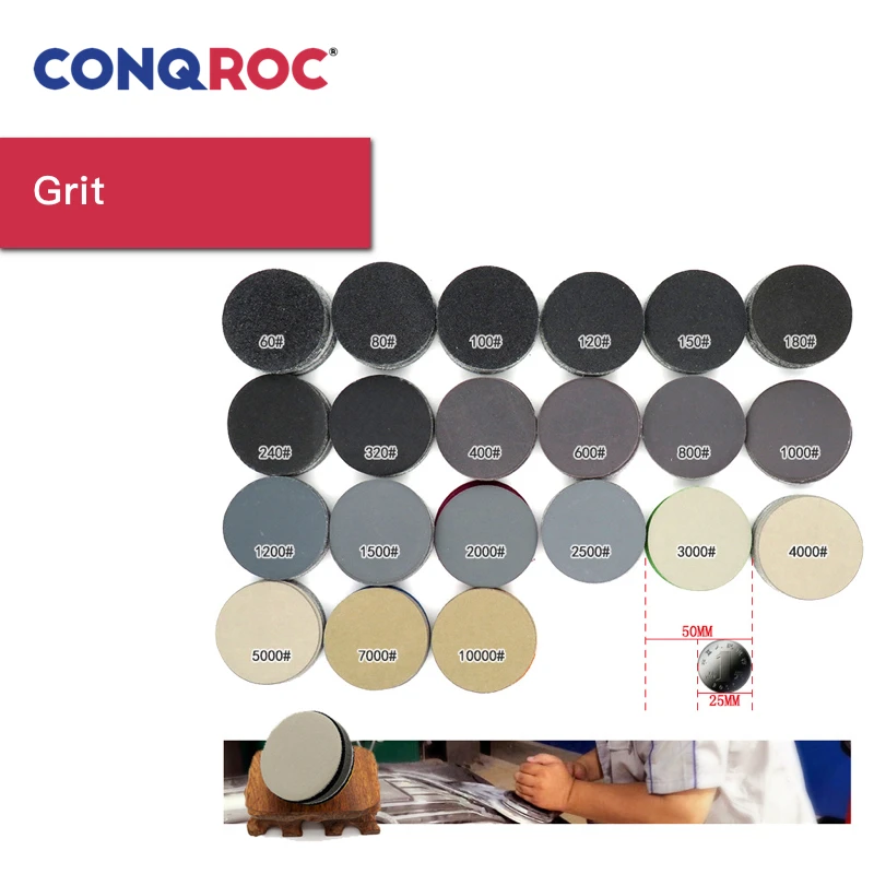 -Тип: шлифовальные диски -Диаметр: 50 мм (2 дюйма) -Задняя часть: крепление на липучке -Зернистость: 60 #, 80 #, 100 #, 120 #, 150 #, 180 #, 240 #, 320 #, 400 #, 600 #, 800 #, 1000 #, 1200 #, 1500 #, 2000 #, 2500 #, 3000 #, 4000 #, 5000 #, 7000 #, 10000 # -Штук в упаковке/Чехол: 100 -Для зеркальной отделки рекомендуется использовать зернистость 5000 ~ 10000.