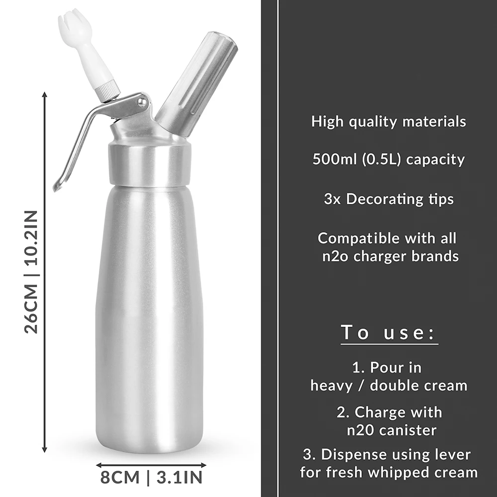 Вы искали простой способ сделать сладкое угощение, шоколадный мусс, напитки и десерты, которые имеют вкусные, аппетитные, пушистые взбитые сливки? Если да, то этот дозатор для взбитых сливок-именно то, что вам нужно. Идеально подходит для питания и выпечки, а также для приготовления десертов и горячих напитков, что является прекрасным дополнением к любой домашней или коммерческой кухне.