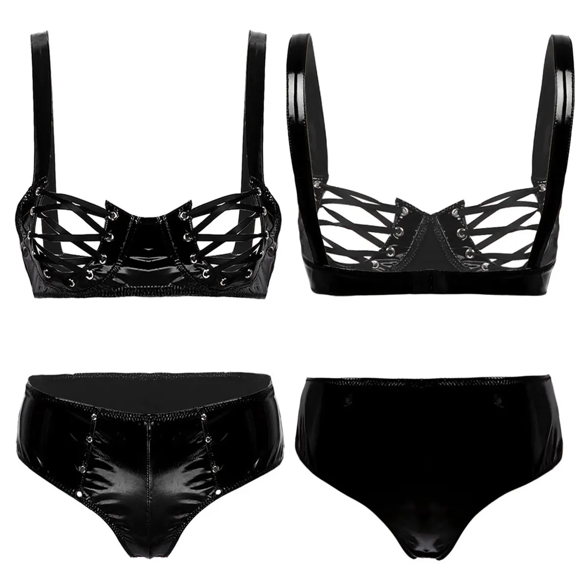 Женские с мокрым эффектом женское белье из лакированной кожи набор широких плеч и ремешками через подъем, декорированные кружевом и бисером на шнуровке бюстгальтер с чашечками топ с низкой посадкой, нижнее белье, трусы