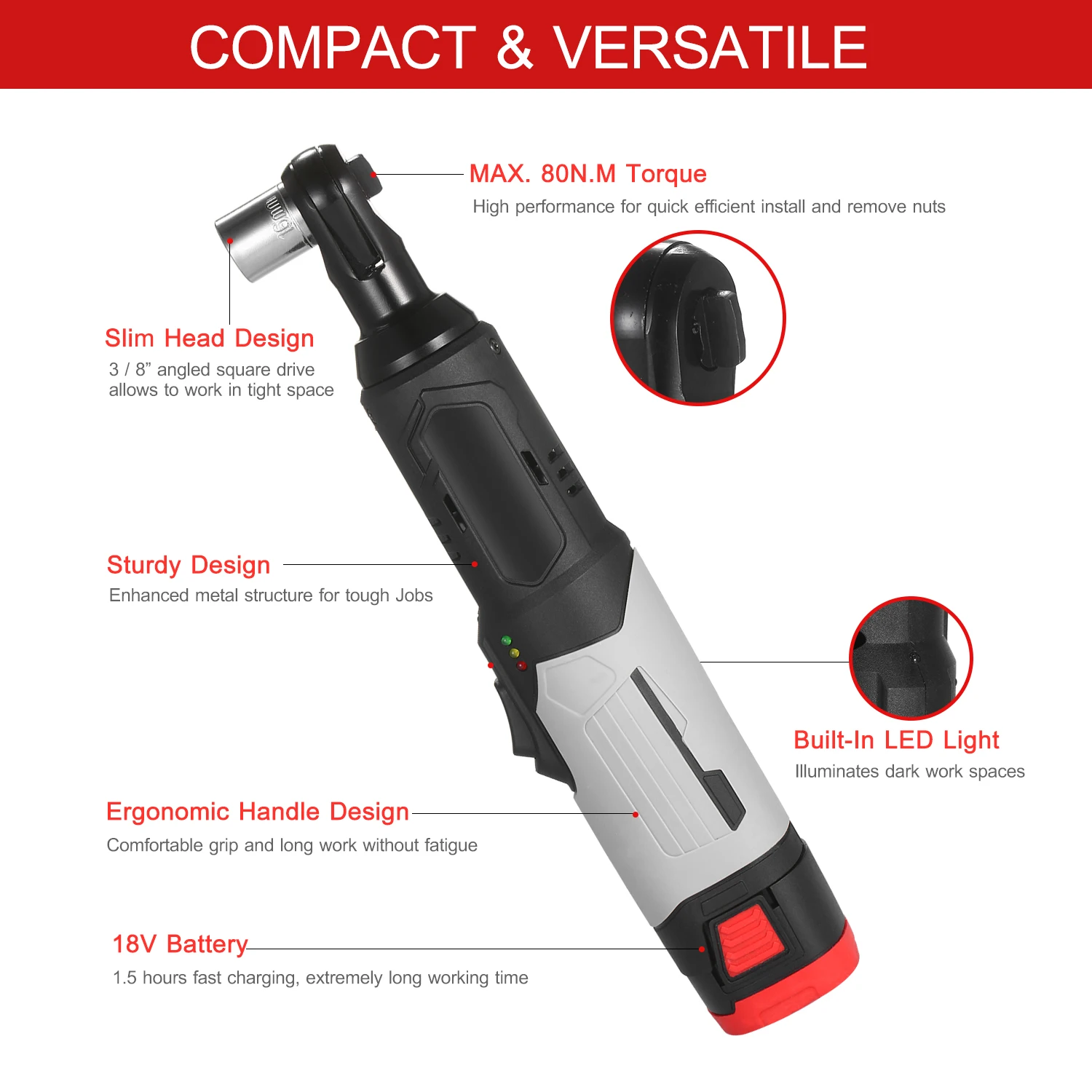 Conmpact & легкий вес -- весит всего 1,56 фунтов, разработан с ультра-тонкой головкой и корпусом делает электрический гаечный ключ rachet может легко достигать любых плотных мест для трещоточных гаек и болтов, делает его идеальным для любого технического обслуживания, строительства или ремонта дома.