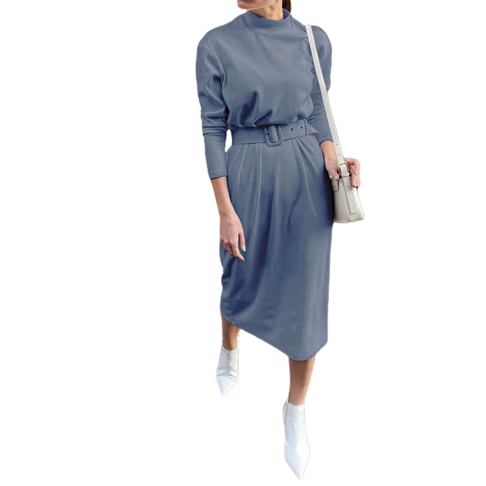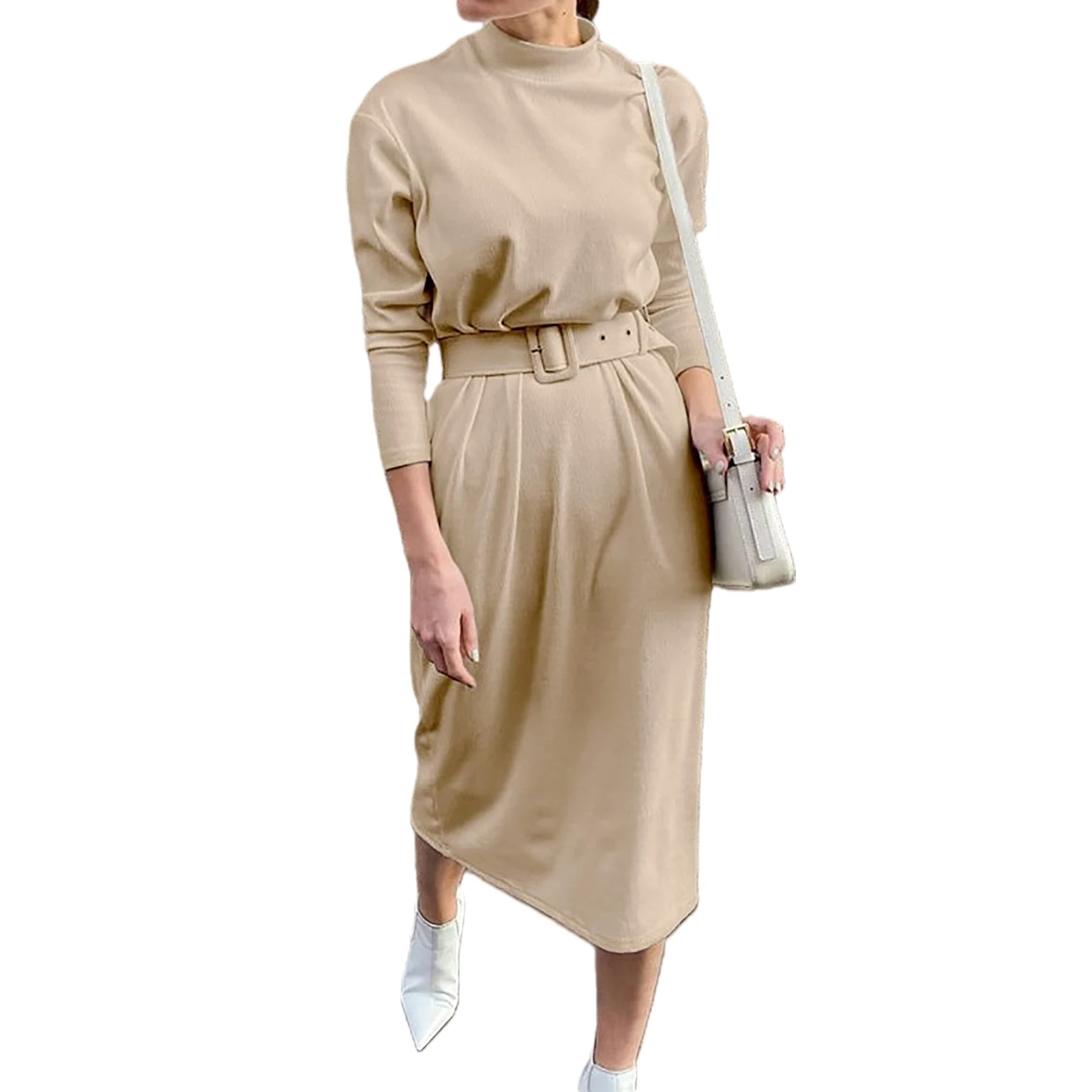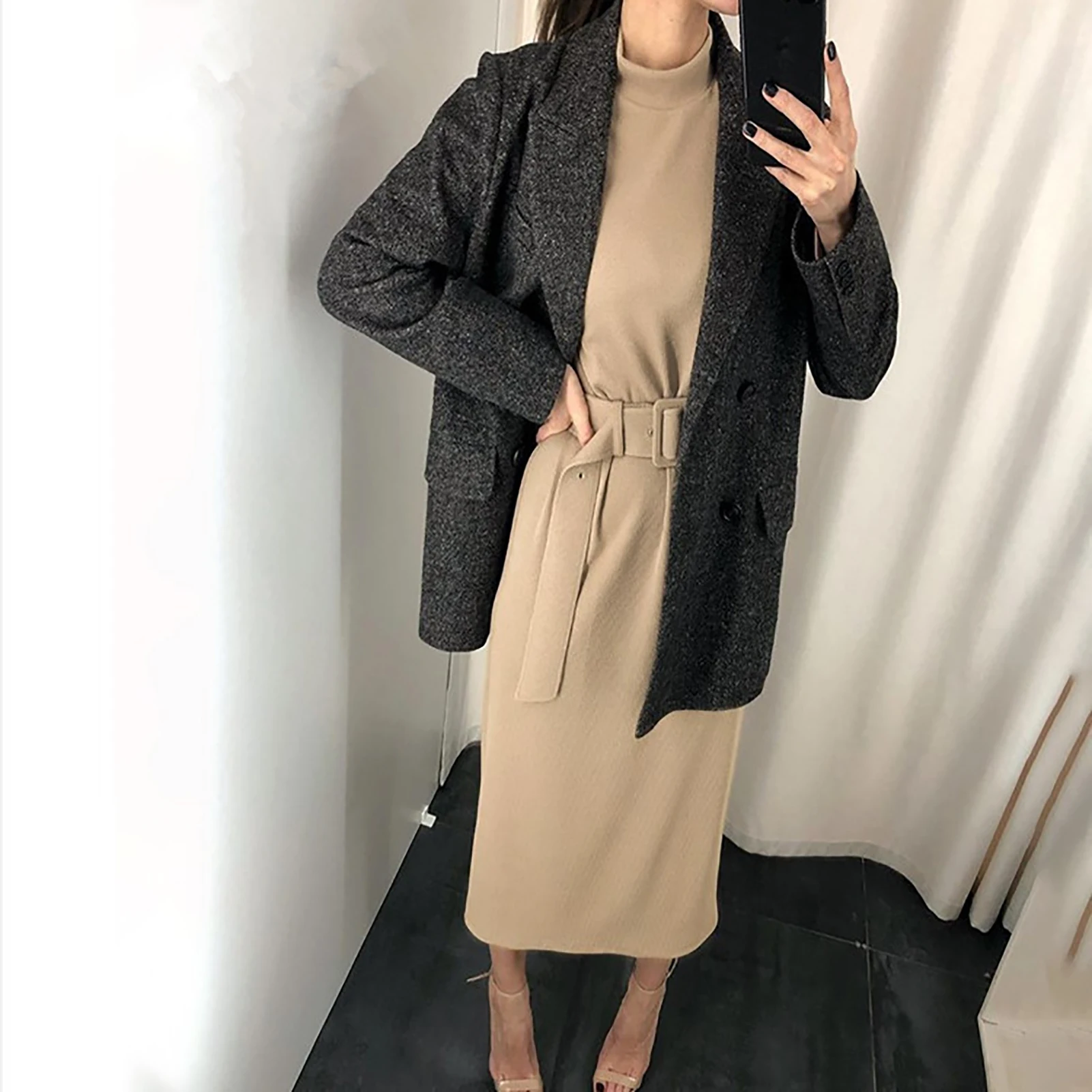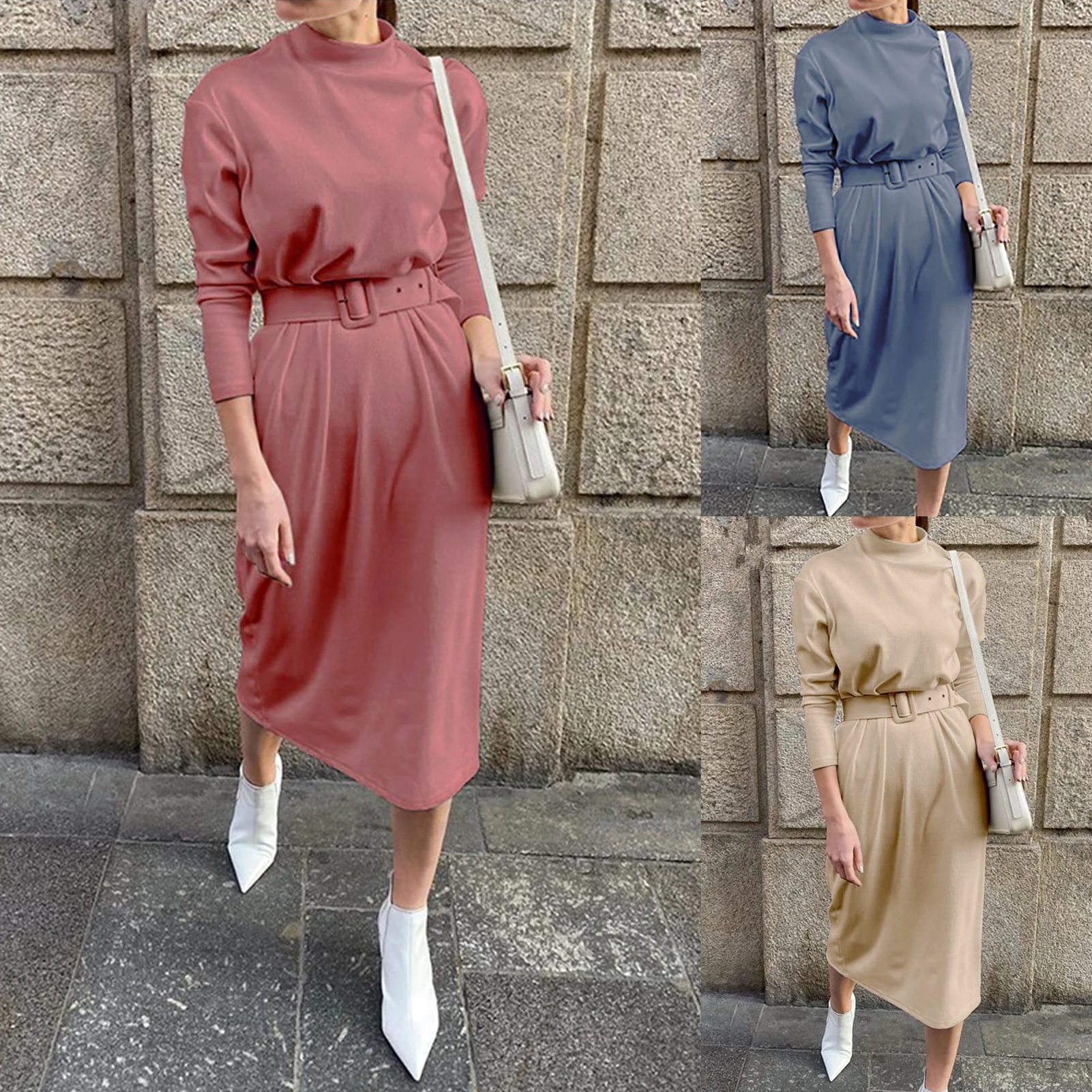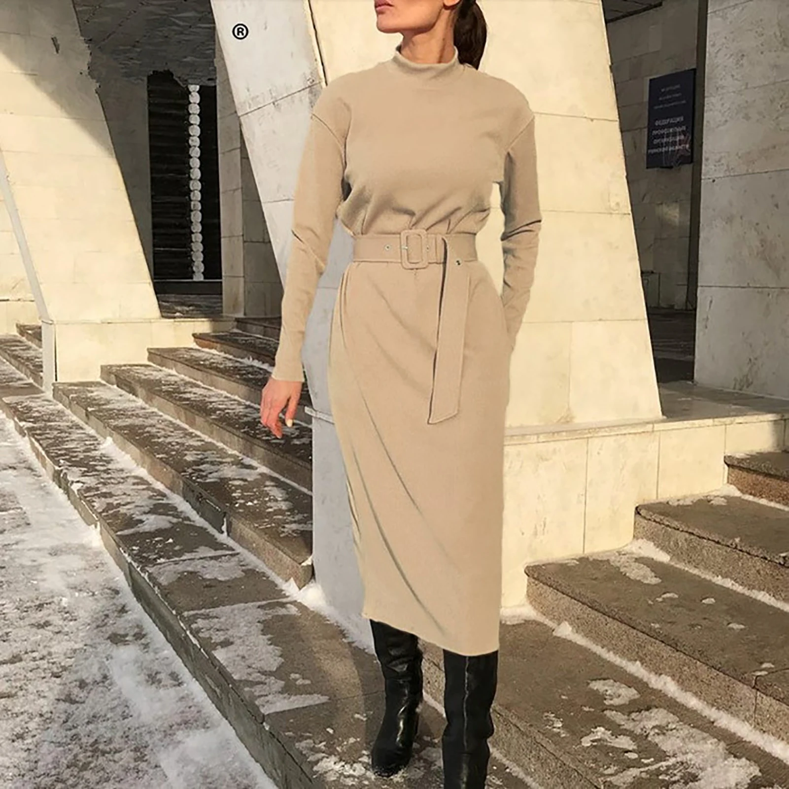 Женское осенне-зимнее однотонное трикотажное платье миди с длинным рукавом и воротником