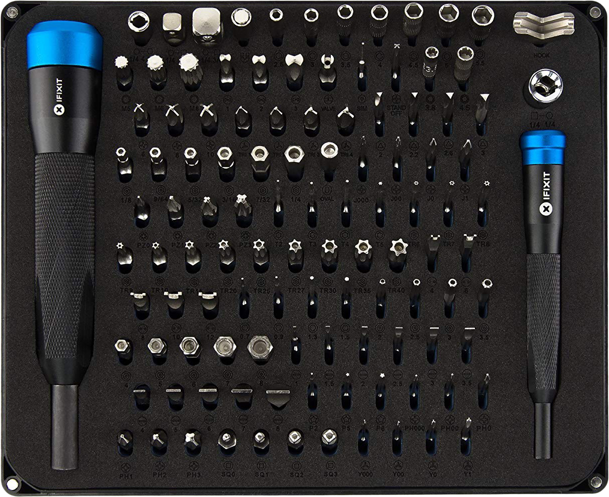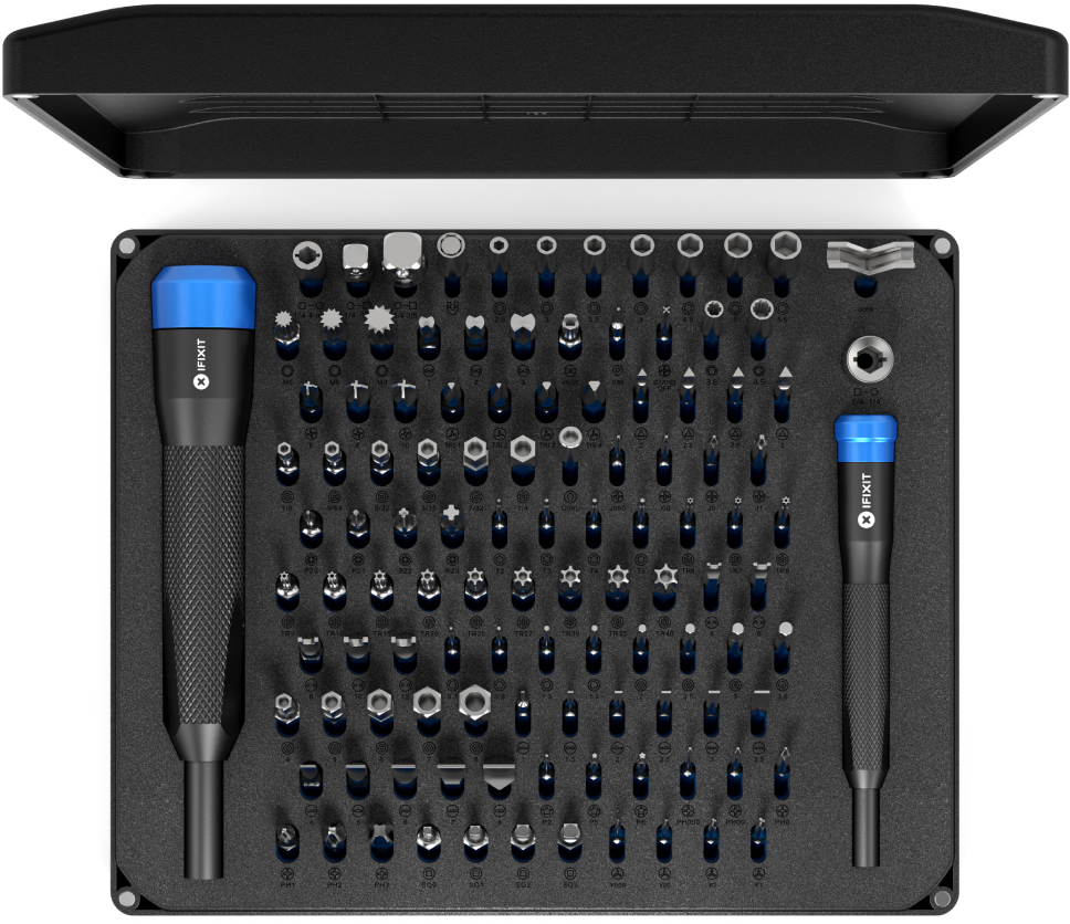 iFixit Manta Driver Kit IF145-392-1 представляет собой набор инструментов для качественного полноценного ремонта портативной техники. Он включает широкий ассортимент бит из 112 наименований, намагниченные рукоятки двух размеров, а также удобный кейс с магнитной крышкой для хранения и переноски. Внутри он имеет лоток из EVA-пены, поделенный для удобства на зоны. Крышку можно использовать как сортировочный лоток во время работы, установив ее горизонтально при помощи магнитного крепления.