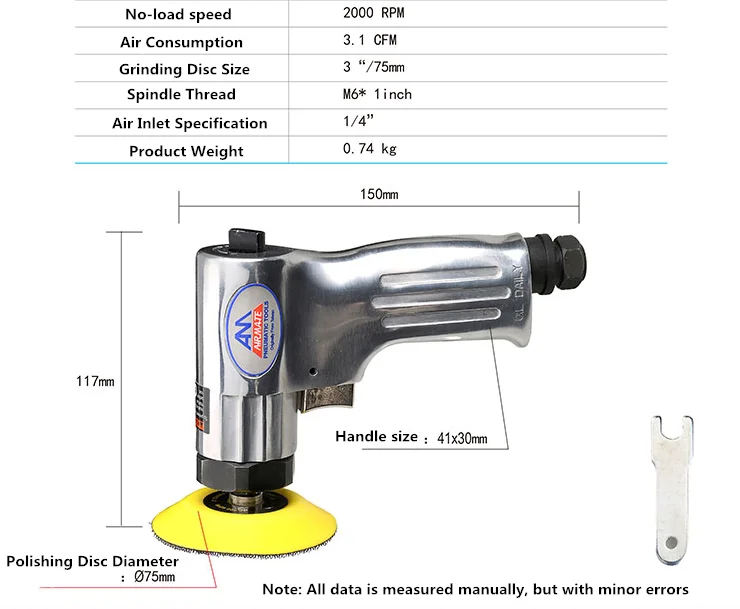 Скорость без нагрузки: 2000 об/мин Расход воздуха: 3.1CFM Спецификация воздухозаборника: 1/4'' Размер шлифовального диска: 3 ''-75 мм Вес изделия: 0,74 кг