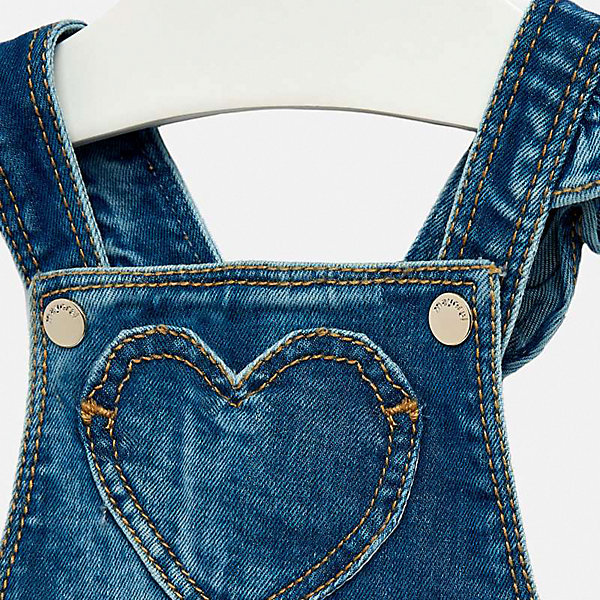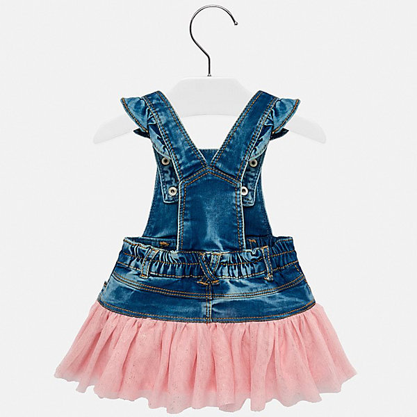 Сарафан из джинсовой ткани с контрастной юбкой в складку, которая выполнена из контрастного двухслойного материала. Широкие удобные бретельки, украшенные оборками, регулируется при помощи кнопок, обеспечивая комфортную посадку.