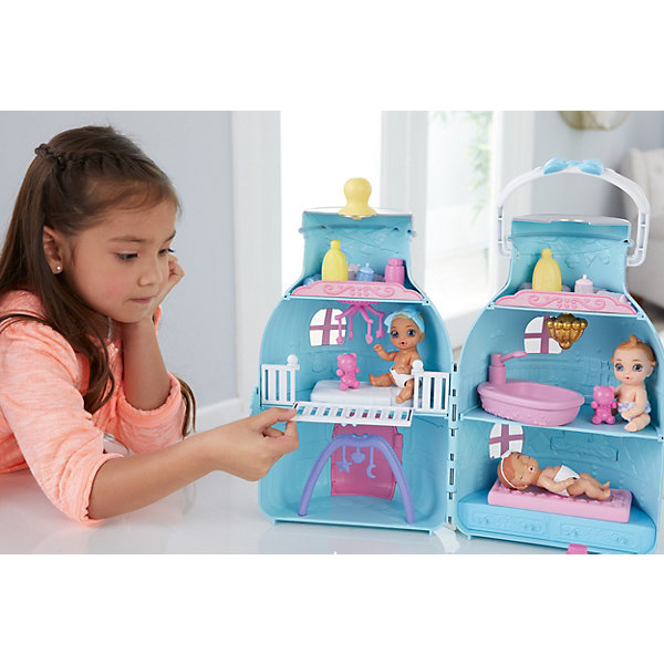 • в комплекте: домик, куколка, ванночка с душем, мебель, подгузник, бутылочка, расчёска, медвежонок, бутылочка с тальком и шампунем