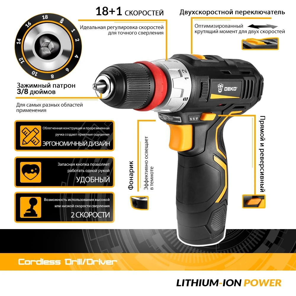 Аккумуляторная дрель DEKO GCD12DU3 предназначена для строительных, слесарно-монтажных работ. Инструмент помогает быстро высверливать отверстия нужного диаметра как на деревянной, так и металлической поверхности, быстро вкручивать или извлекать крепеж.