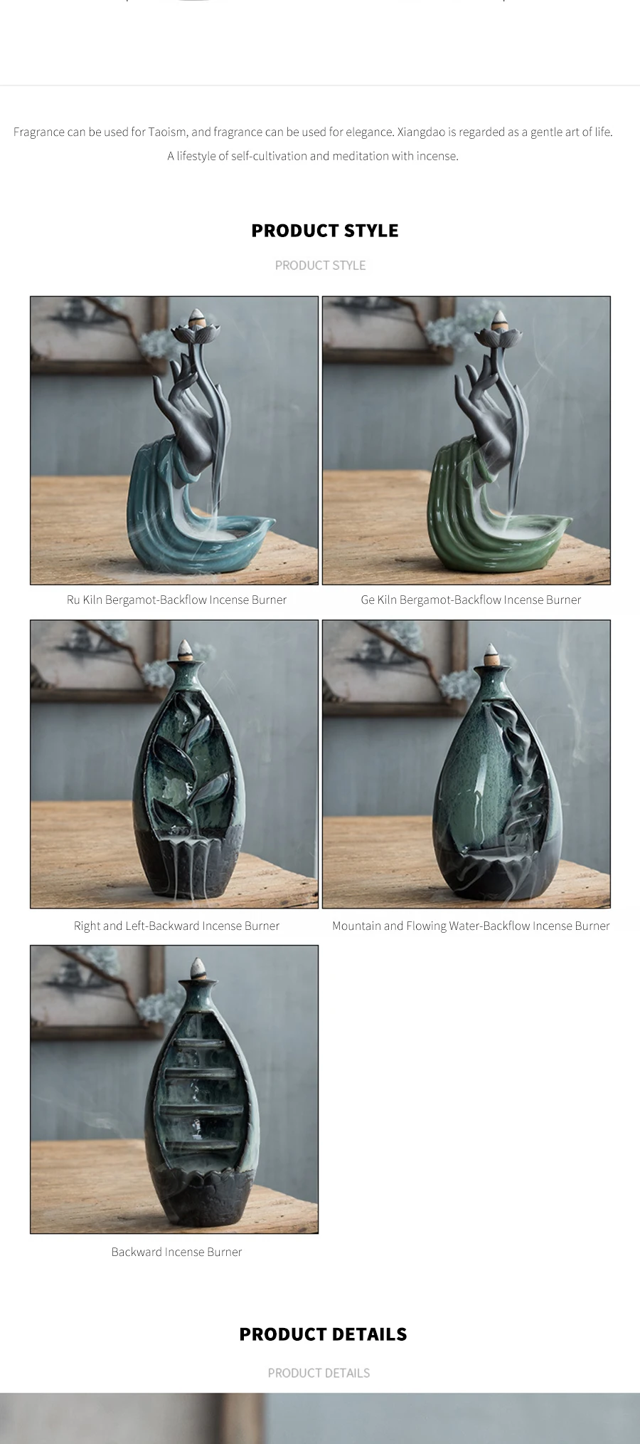 Особенности:Креативный дизайн: креативная керамическая конфорка для благовоний, дизайн лотоса бергамота, классическая элегантность, струящийся от водопада дым, соединения слева и справа, добавляют наслоения.