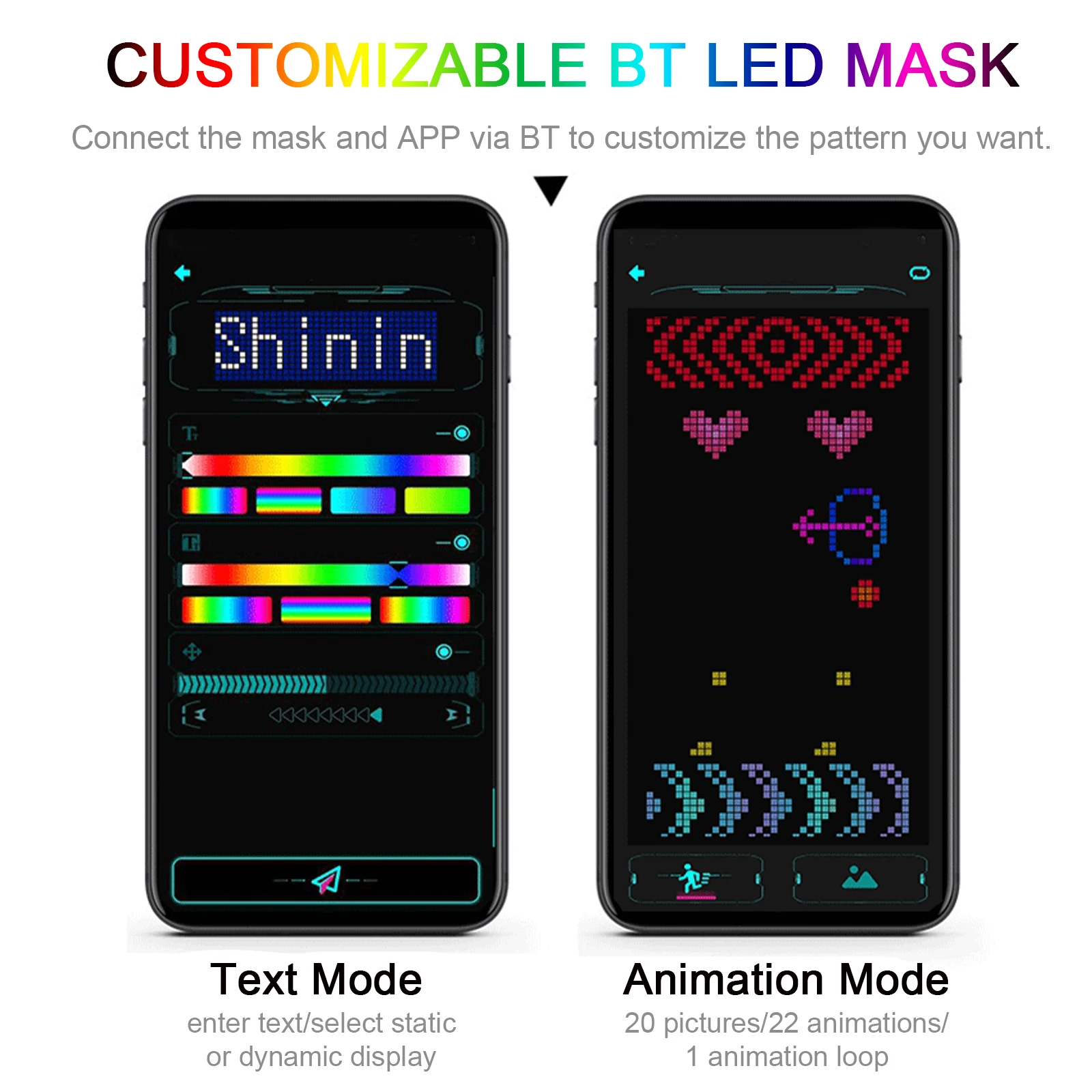 Customizable настраиваемая светодиод BT маска: вы можете настроить изображения (20 изображений и анимационный интерфейс содержит 22 анимации, 1 анимационный цикл), показанный на поверхности маски. Подключите маску и приложение через BT, чтобы настроить шаблон, который вы хотите.