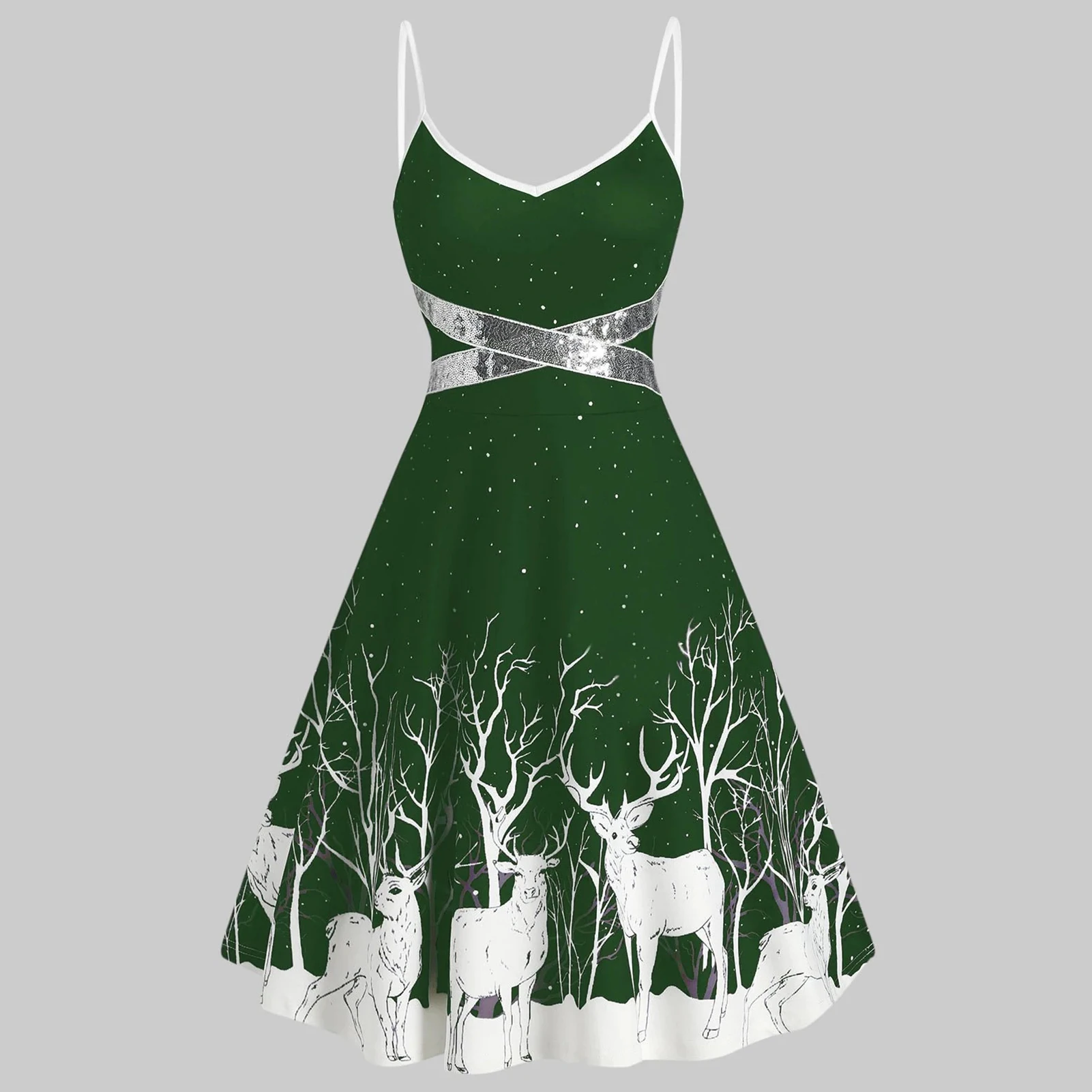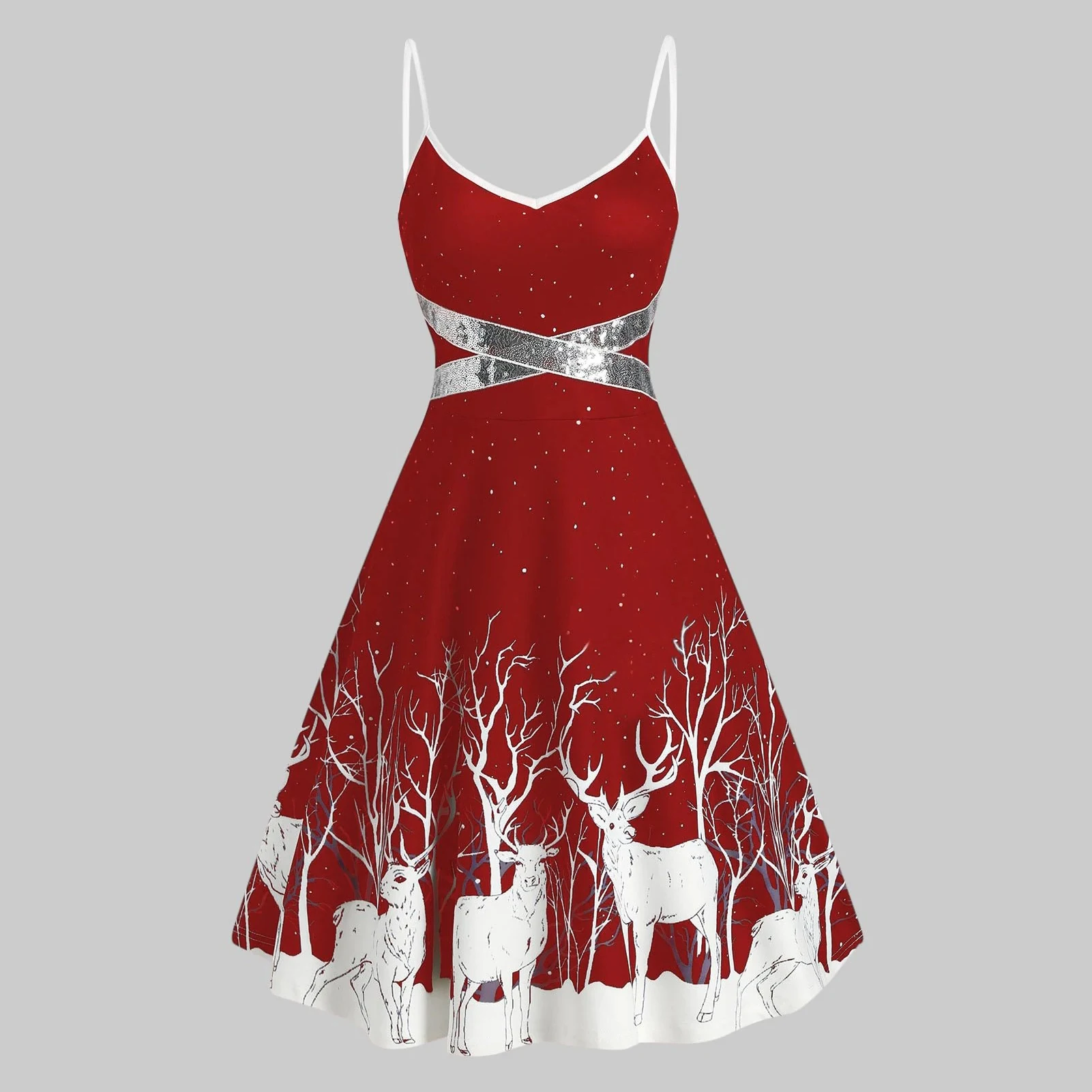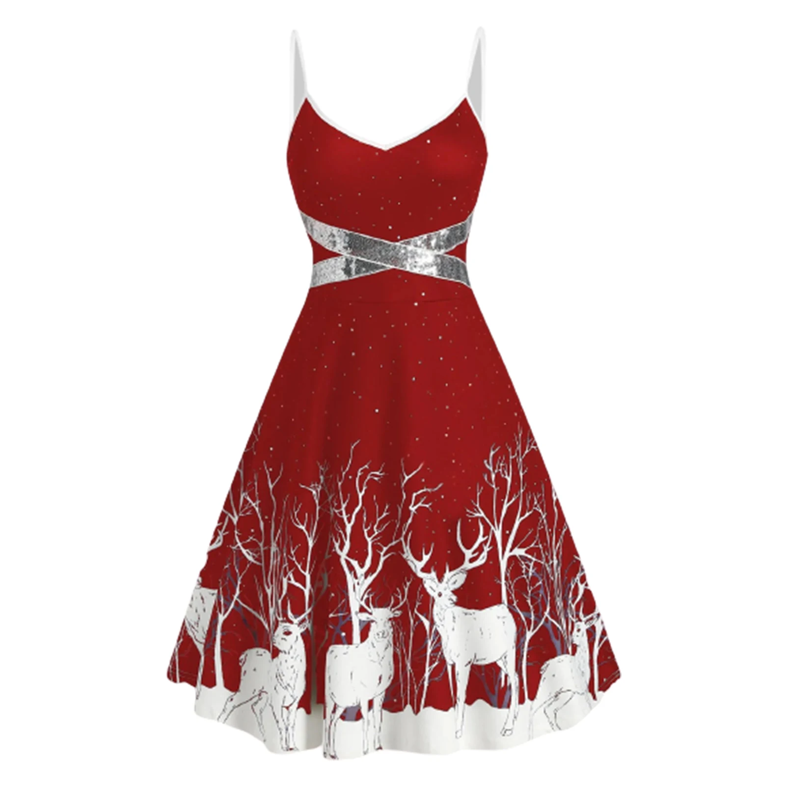 Рождественское женское платье с принтом лося, регулируемое платье на бретельках без рукавов с большим подолом