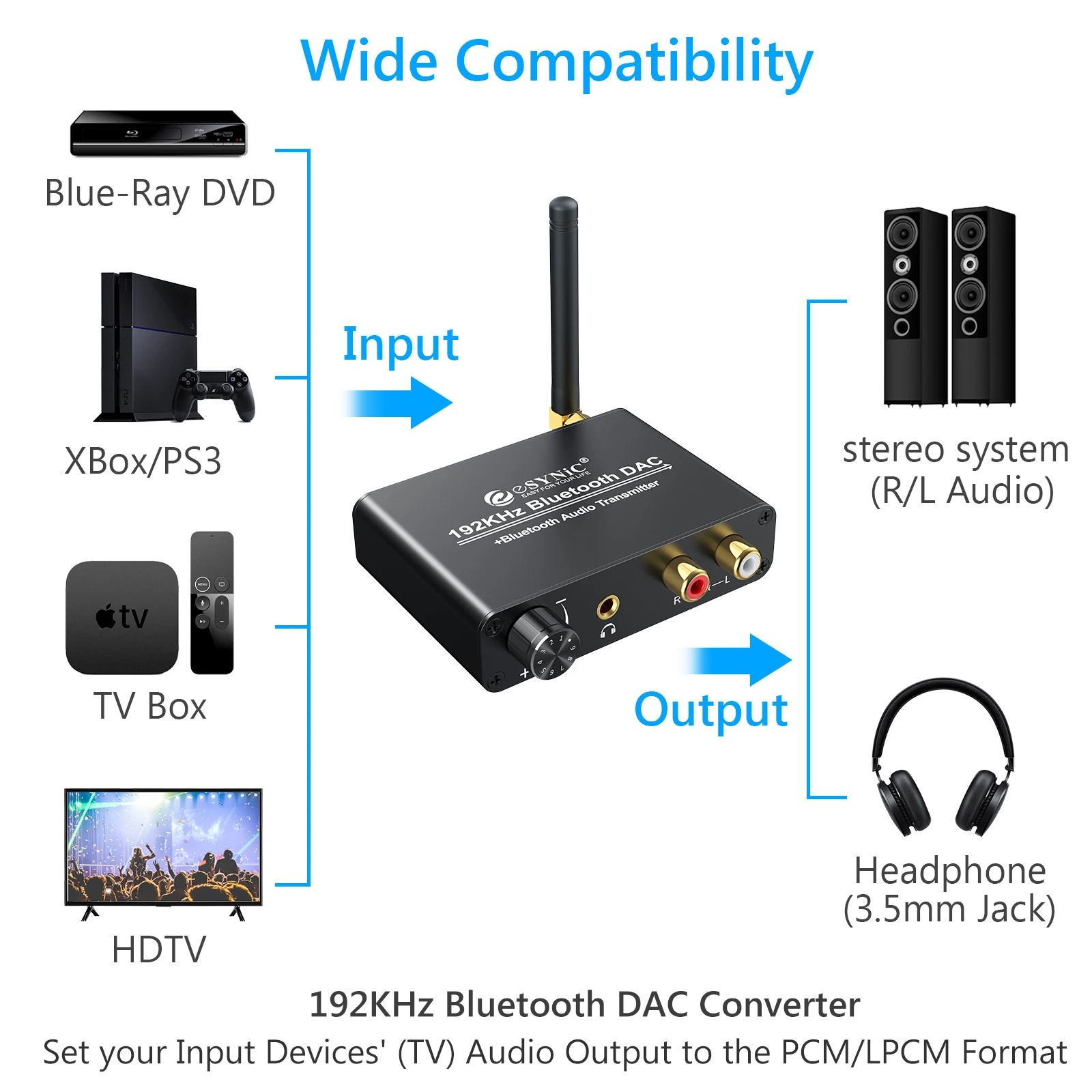 Этот DAC и bluetooth-передатчик может преобразовывать оптические или коаксиальные цифровые аудиосигналы в стерео аналоговые сигналы и передавать сигналы через Bluetooth-совместимый передатчик. Помощь в подключении высококачественных цифровых аудиосигналов к обычным av-усилителям или к устройствам Bluetooth-Compatiblereceiving, таким как bluetooth-совместимые гарнитуры и bluetooth-совместимые устройства.