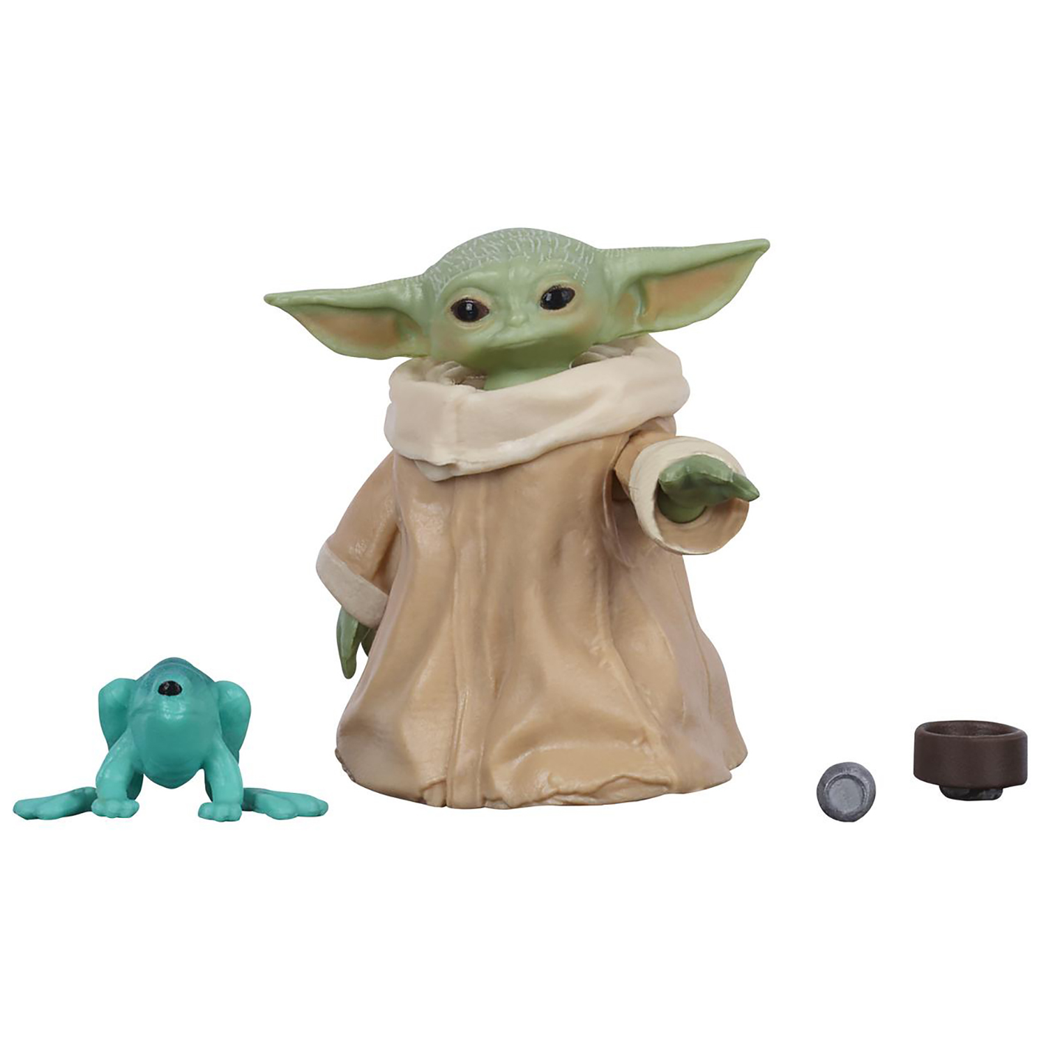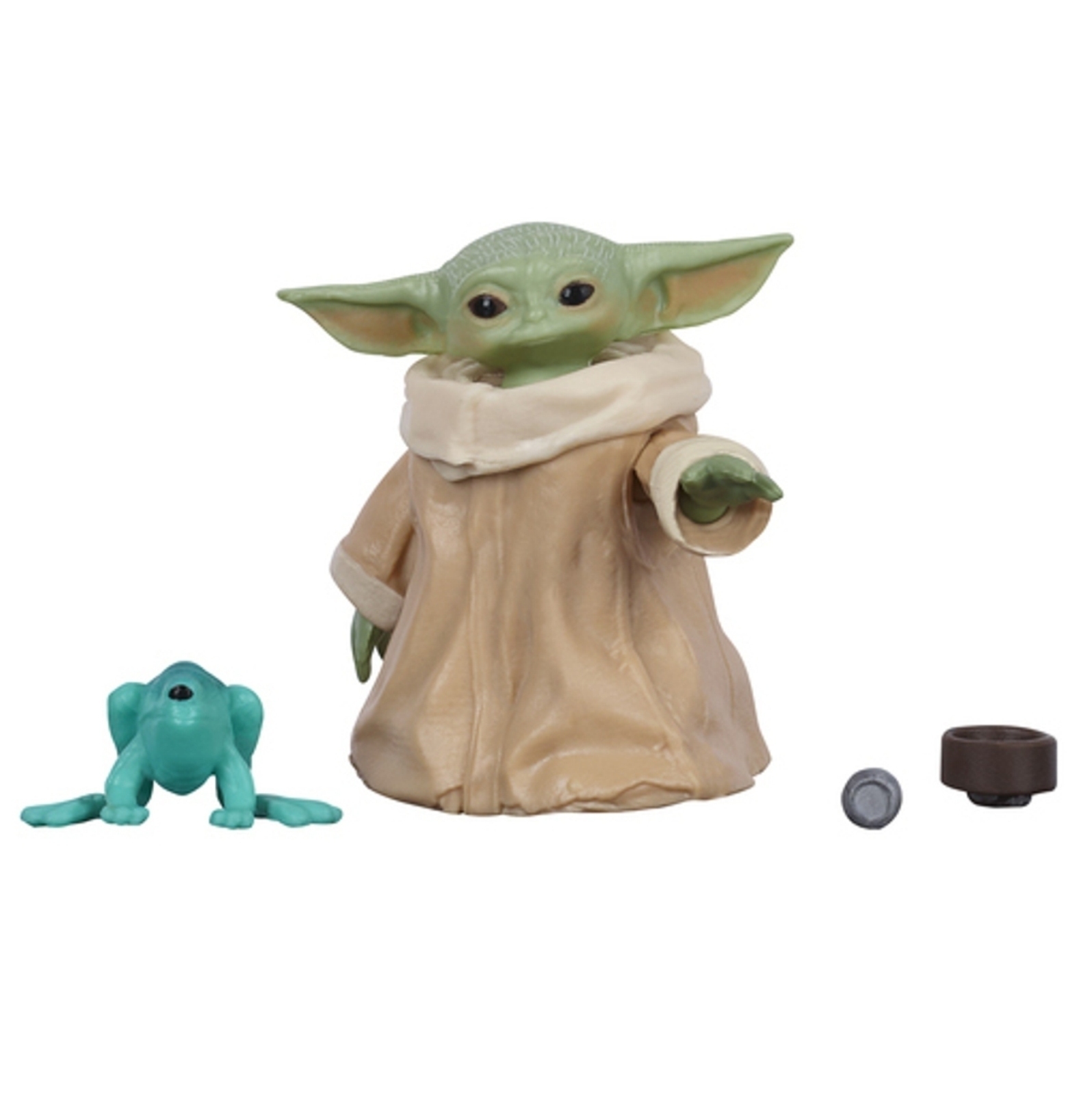 Фигурка представлена вместе с аксессуарами, выполненными по мотивам телевизионного сериала - мячиком, мисочкой костного бульона и сорганской лягушкой на закуску
