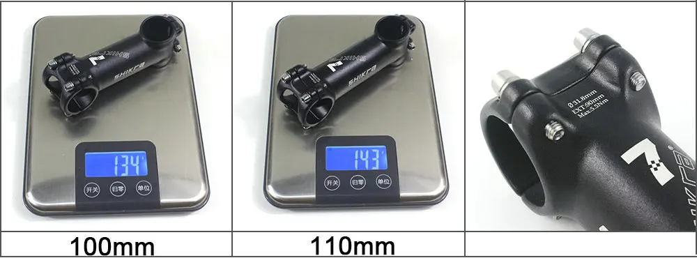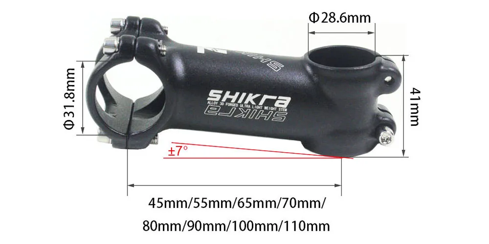 - Name: High-Strength Bicycle Stem - Material: Aluminum Alloy - Color: Matte Black - Handlebar Clamp Diameter: 31.8mm - Fork Clamp Diameter: 28.6mm - Degree: ±7 Degree - Weight: About 104-142g - Use for: Mountain Bike (MTB) / Road Bike - Length: 45mm/55mm/60mm/70mm/80mm/90mm/100mm/110mm (Detail size please refer to the photo below)
