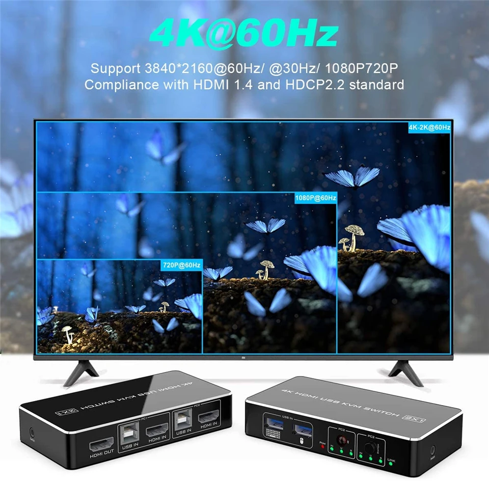 · Переключатель KVM 4K-совместим с HDMI 1,4 и HDCP1.4 или HDMI 2,0 и HDCP2.2. Поддержка разрешения до 4K @ 30HZ или 4K @ 60Hz, Совместимость с 1080p или ниже. С EDID auto считывает и запоминает параметры монитора (EDID) при прямом подключении HDMI для поддержания наилучшего разрешения дисплея