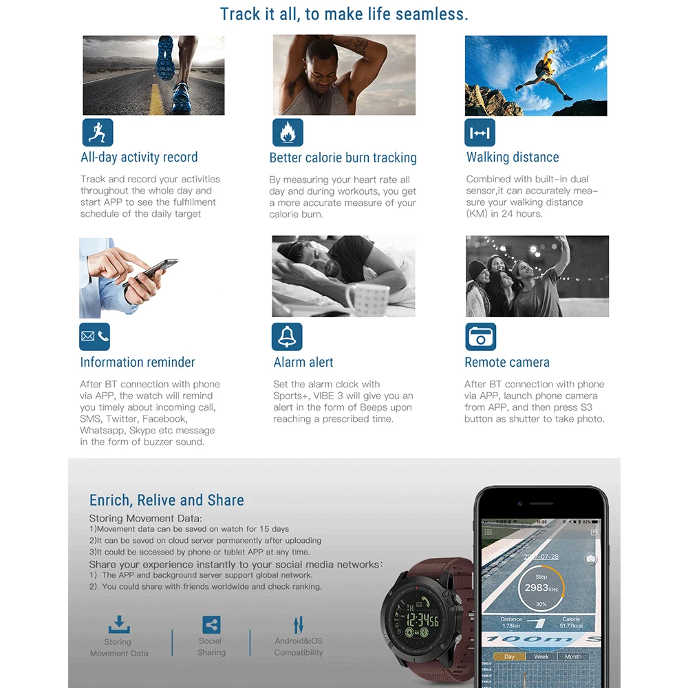 Запись активности на весь день, лучшее отслеживание калорий, расстояние ходьбы, напоминание о информации, оповещение, удаленная камера