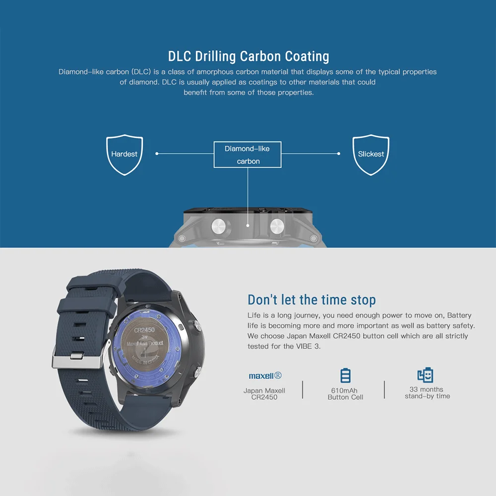 Водонепроницаемость 50 метров (IP67)(Пожалуйста, не носите его во время принятия душа или плавания и не нажимайте кнопки под водой.) 33 месяца в режиме ожидания; Japan Maxell CR2450(610 мАч) кнопочный аккумулятор; 1,24 дюймовый FSTN/полный обзор (видимый Солнечный свет); Corning Gorilla Glass 4; Датчик гравитации; Хранение данных о движении; Для iOS и Android; Отличительные особенности: Текущая дата, подсчет шагов, Сожженный калорий, ходьба, настройка будильника, функция секундомера, удаленная камера, напоминание о входящем звонке, информационное напоминание (SMS,Facebook,Twitter,Skype,WhatApp, weChat); Языки приложения: Упрощенный китайский, английский, французский, итальянский, немецкий, русский, испанский, португальский, японский, арабский;【 IP67 защита от пыли и воды и 1,24 дюйма FSTN/полный обзор солнечного света