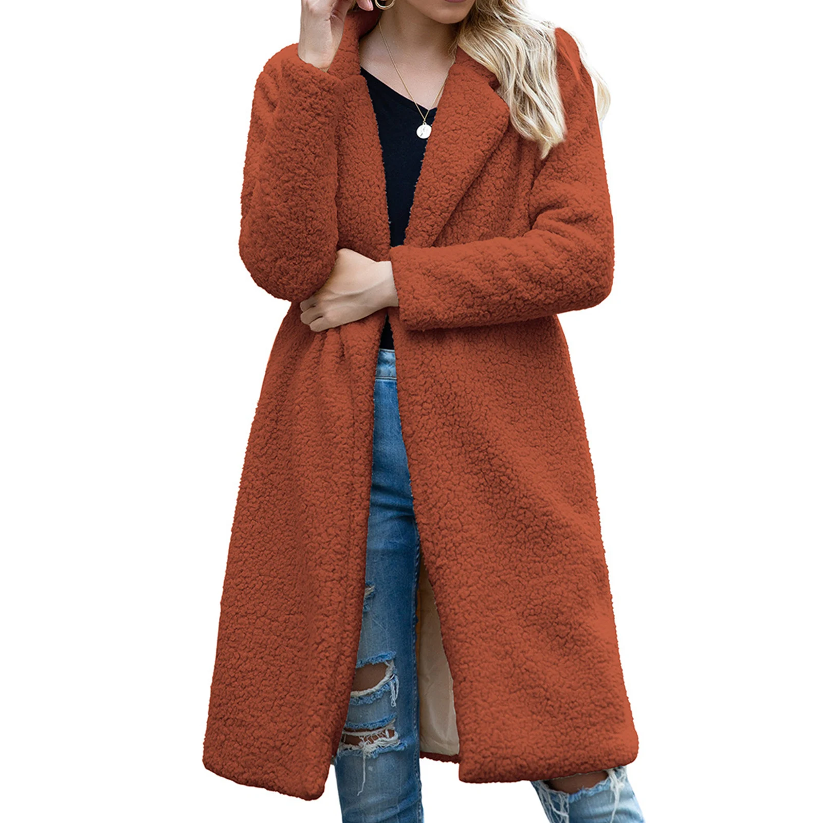 Женское зимнее теплое пальто из искусственного флиса с длинным рукавом и отворотом
