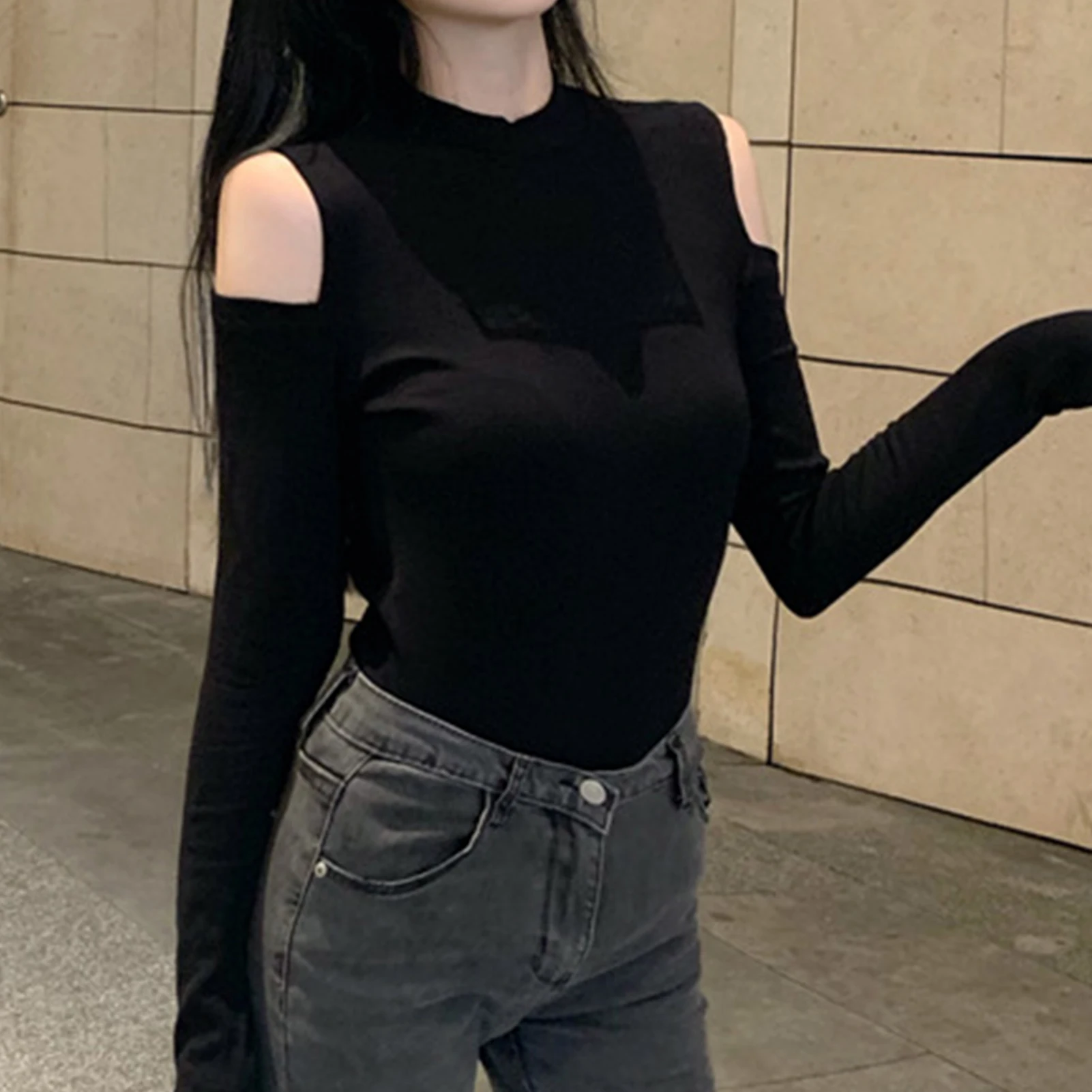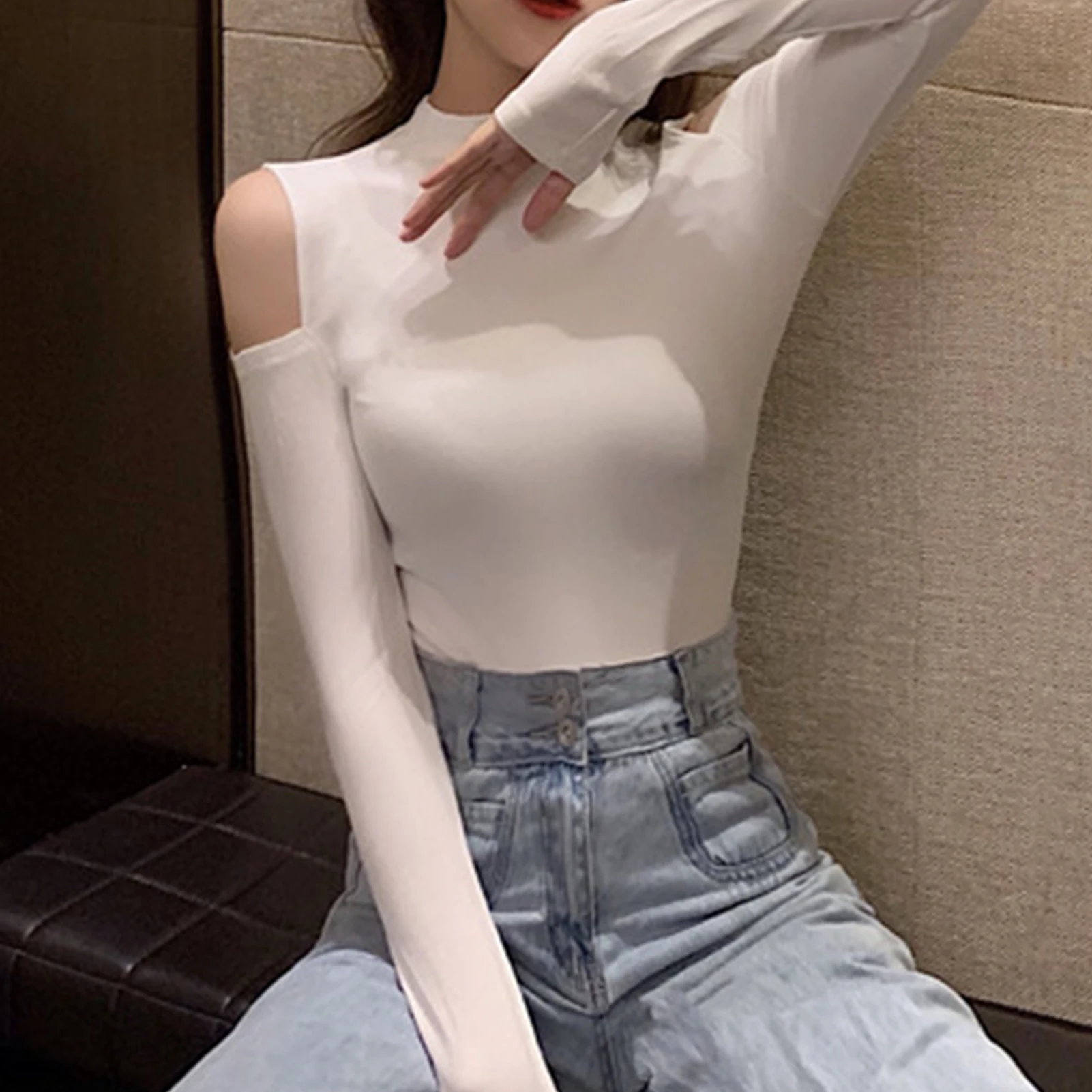 Женская Осенняя однотонная блузка с длинными рукавами и открытыми плечами, облегающая футболка