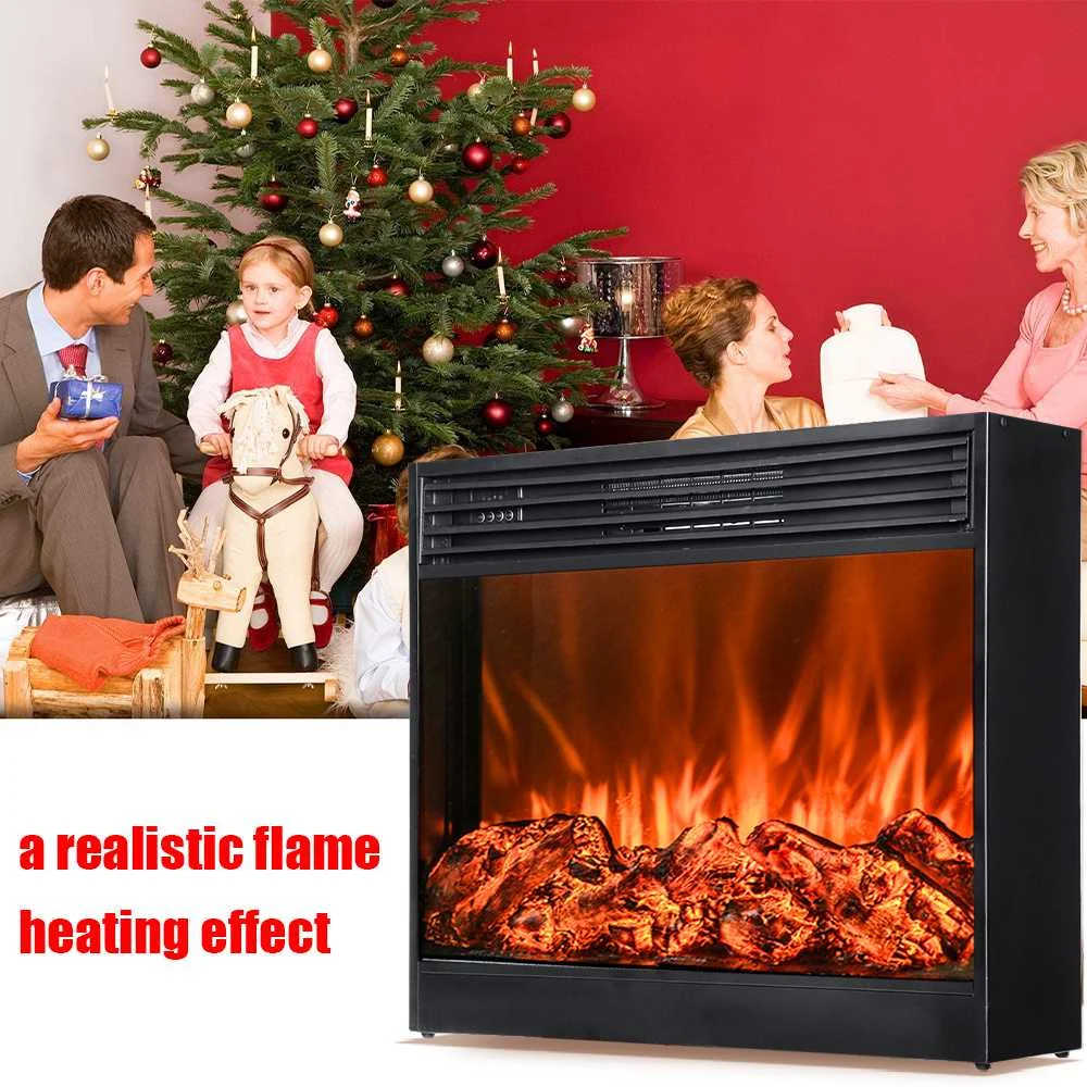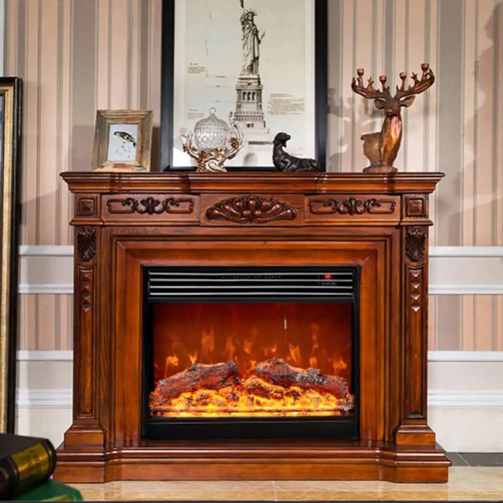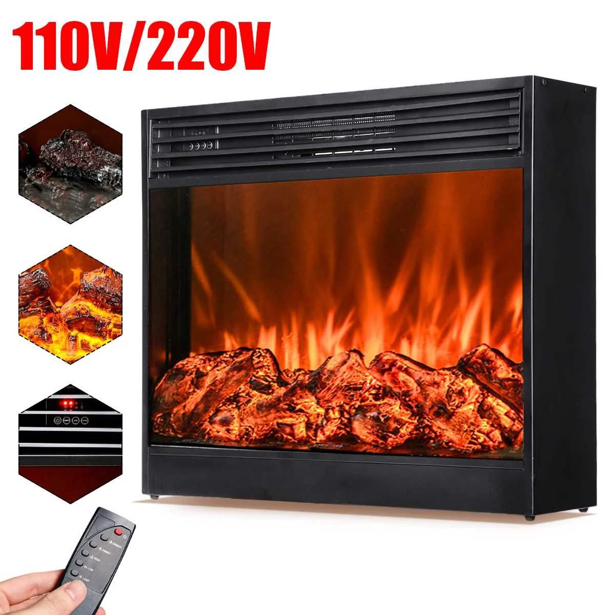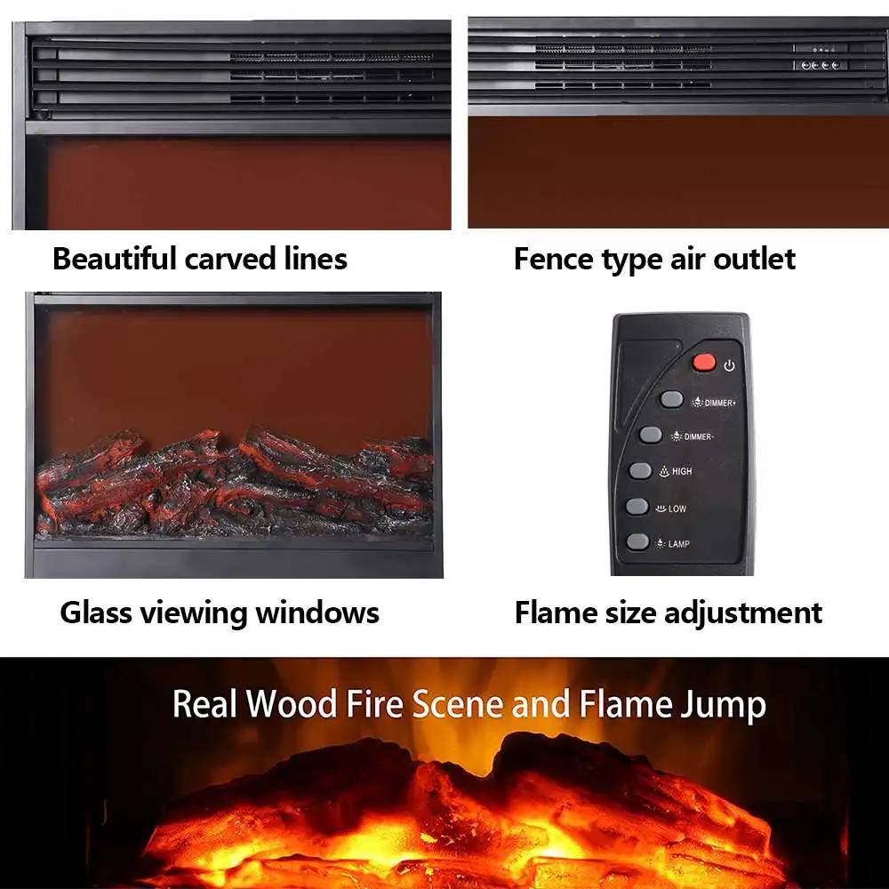 -Разработан с классической каминной окантовкой, черной рамкой и стеклянной передней частью; Расположение с яркими деталями с блестящим пламенем и деревом.