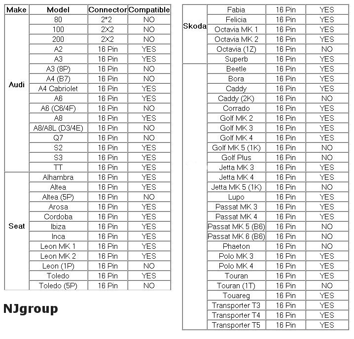 Совместимость с большинством автомобилей volkswag group (volkswag, Audi, Seat и Skoda) с 1994 по 2004 год-более подробную информацию см. В таблице ниже.