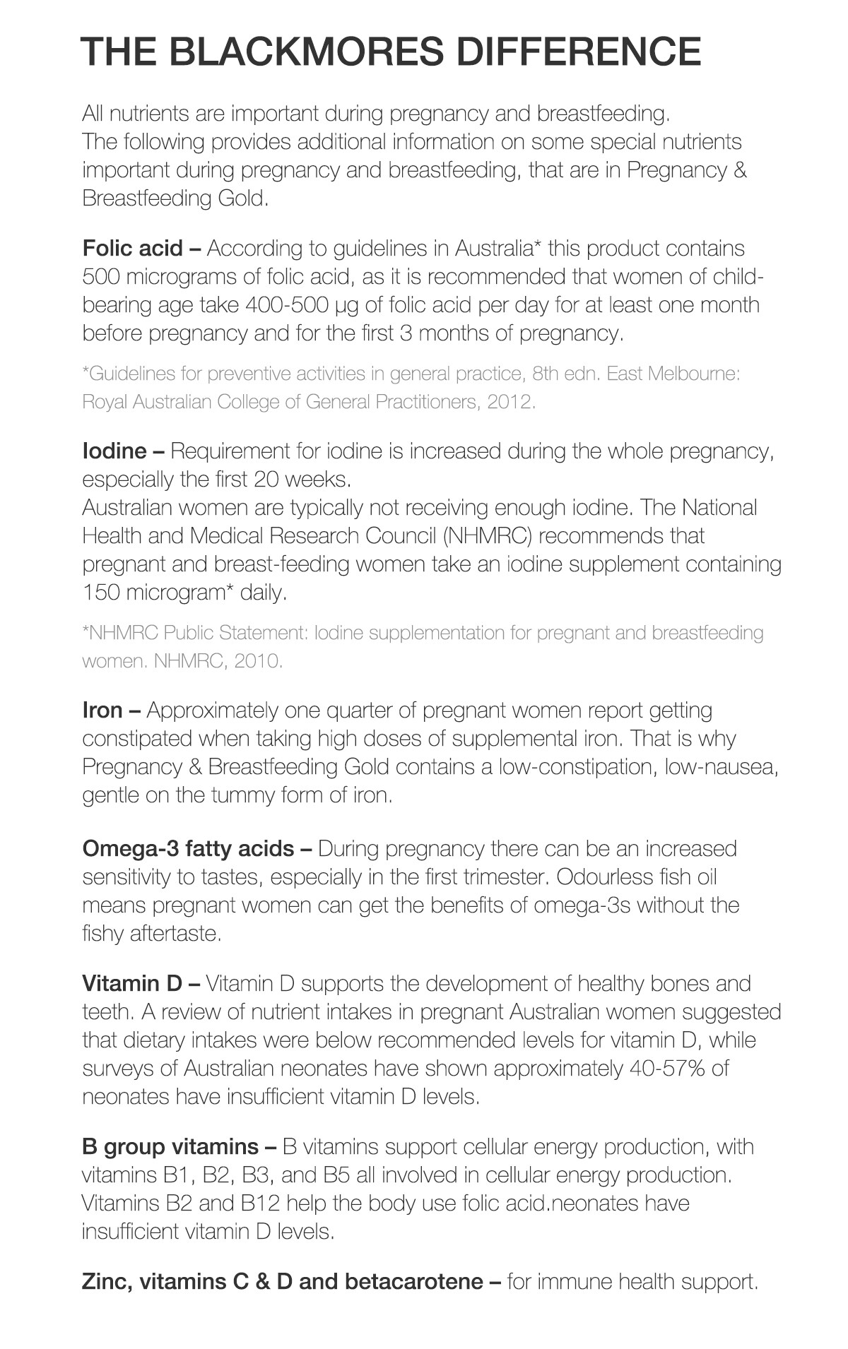 Blackmores беременность и кормление грудью золото обеспечивает 20 важных питательных веществ в общей сложности, включая суточную дозу: