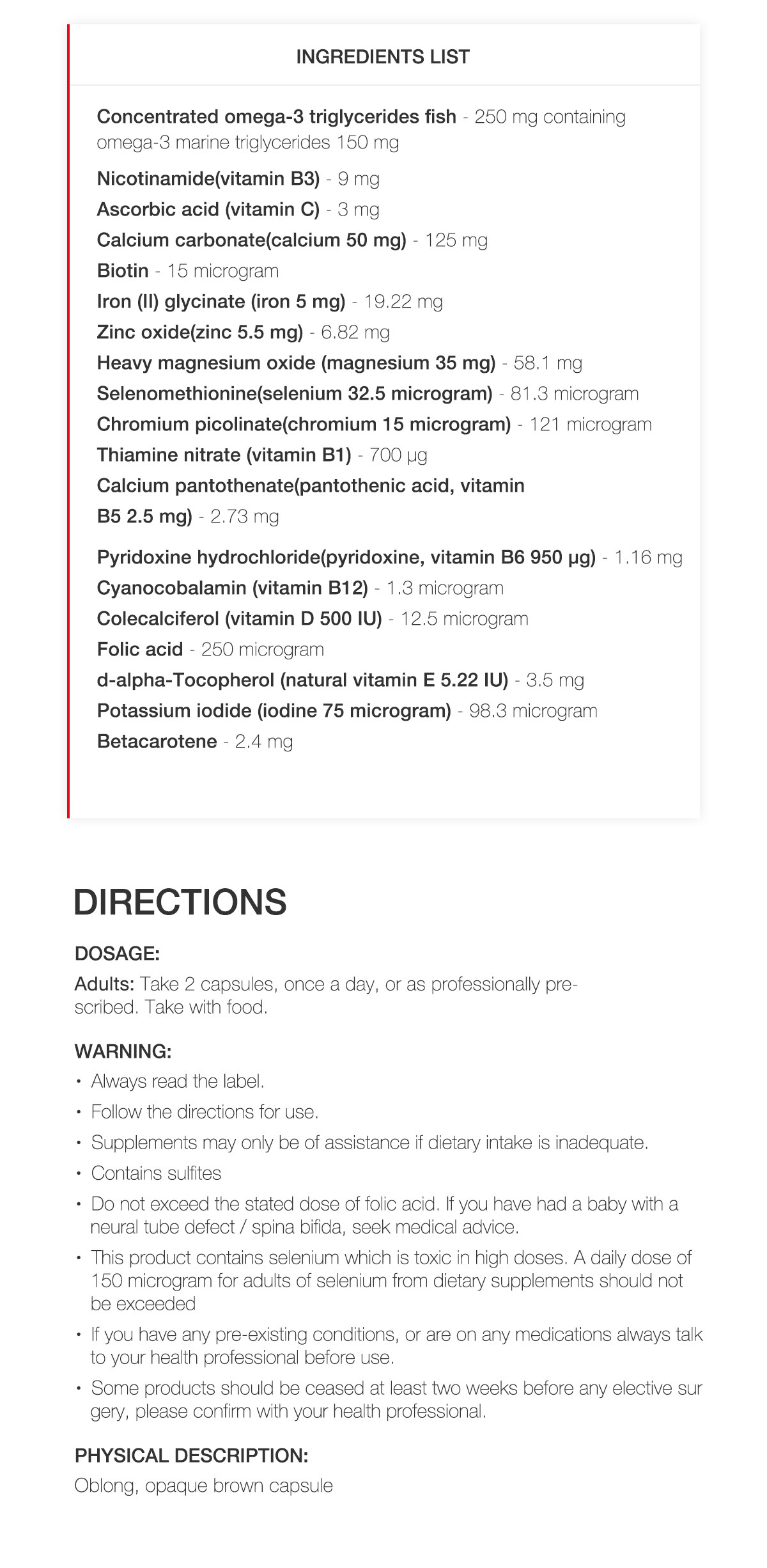 Фолиевая кислота-в соответствии с руководством Австралии * Этот продукт содержит 500 микрограмм фолиевой кислоты, так как женщинам детородного возраста рекомендуется принимать 400-500 мкг фолиевой кислоты в день не менее одного месяца до беременности и первых 3 месяцев беременности.
