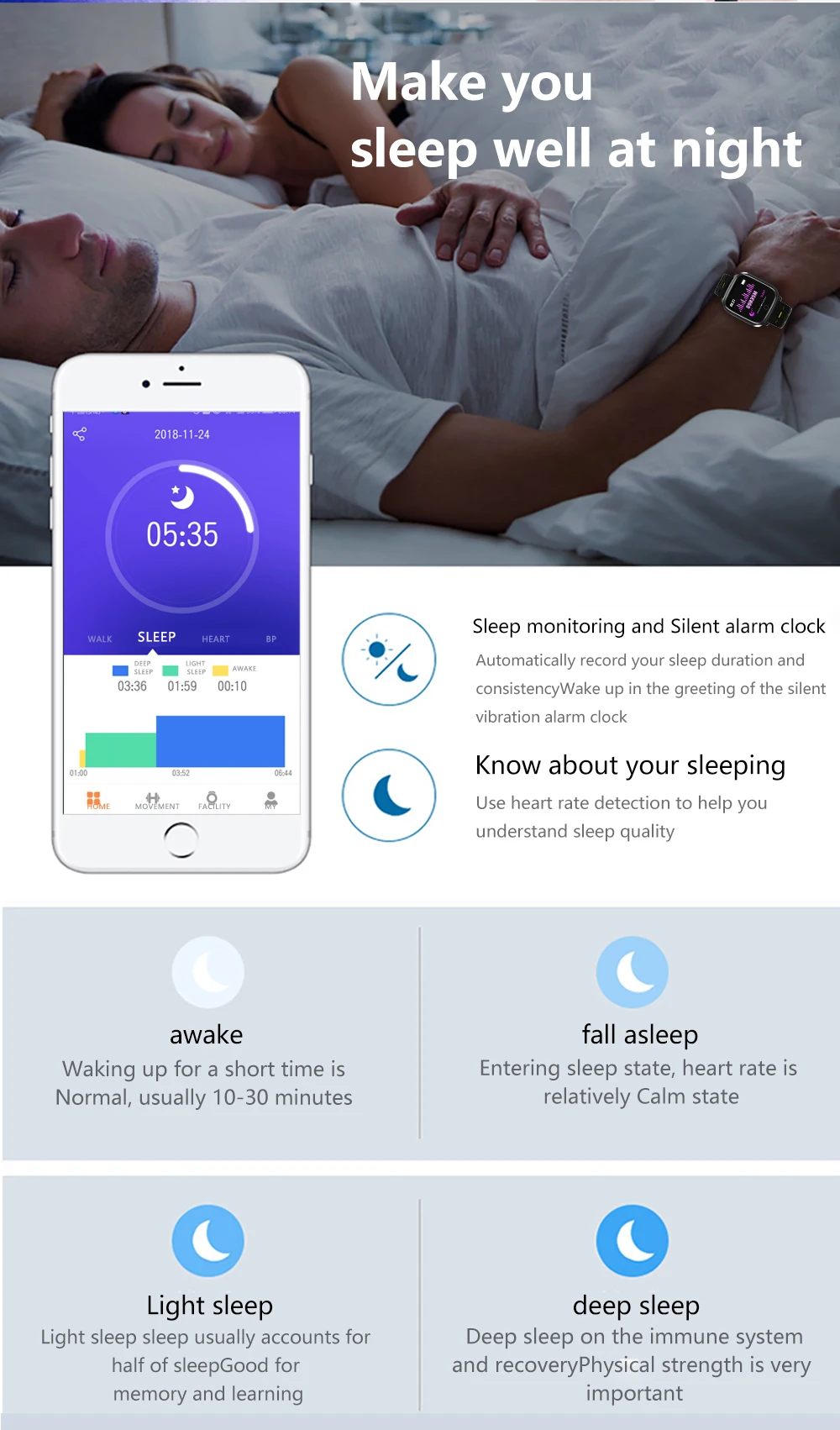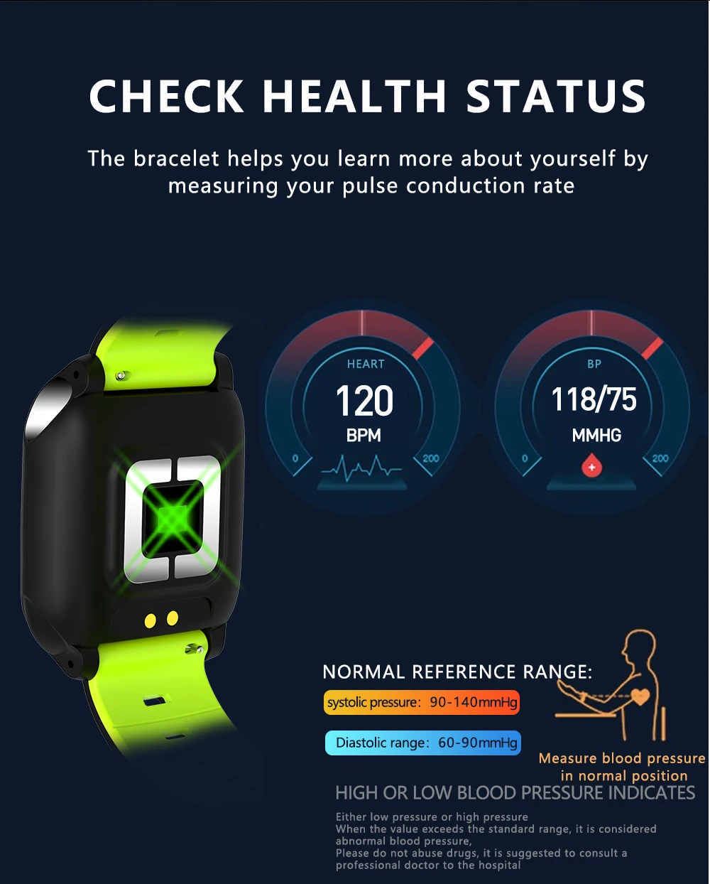 О прогнозе погоды: На часах нет прогноза погоды, мы ничего не писали на странице описания продукта где угодно, и у нас также есть очень официальное заявление, что на часах нет функции прогноза погоды, что касается функционального описания продукта, на странице описания товара все верно, и любое другое описание неверно Характеристики Основные функции: ЭКГ, определение сердечного ритма, сон, артериальное давление, уровень кислорода в крови, шаг, расстояние, калории, секундомер, спортивный режим, напоминание о звонках (номер/Имя звонка), напоминание о сообщении, напоминание о тревоге, яркий экран на запястье и т. д. Основные параметры: Модель: Смарт-браслет ЭКГ Операционная система приложения: IOS8.0 или выше, Android 4,4 или выше Датчик: KX023 Мастер: DA14585 Датчики для ЭКГ: BAC201 Датчик частоты сердечных сокращений: HRS3300 Напоминание о вибрации: напоминание о вибрации двигателя Класс водонепроницаемости: IP67 Поддерживаемые языки: китайский, английский, корейский, испанский, японский, французский, русский, арабский, венгерский, хинди, турецкий, греческий, немецкий, итальянский, чешский, польский, голландский, португальский текст Другие параметры: Размер экрана: 1,3 дюйма 240*240 dpi Тип экрана: TFT Использование экрана: одним касанием, поднимите экран запястья Версия Bluetooth: BLE4.0 Материал ремешка: силикон Аккумулятор: полимерный литий-ионный аккумулятор Емкость аккумулятора: 170 мАч Время работы в режиме ожидания: 7-10 дней Способ зарядки: магнитный USB-кабель для зарядки Время зарядки: около 2 часов Примечание: 1. Носимые устройства контролируют человеческую активность с помощью электронных датчиков. Они находятся на уровне бытовой электроники. Наличие определенного отклонения является нормой. Пользователи должны обрабатывать эти данные объективно. Пожалуйста, не сравнивайте его с больничным оборудованием, которое не является медицинским устройством! Перед использованием отсканируйте QR-код в руководстве, чтобы загрузить приложение и подключить его к часам в приложении. 2. Поскольку прошивка постоянно обновляется, пользовательский интерфейс будет соответствующим образом обновляться. Изображения только для справки, и все зависит от фактического продукта. 3. Нельзя принимать ванну с часами, нельзя принимать часы и принимать душ