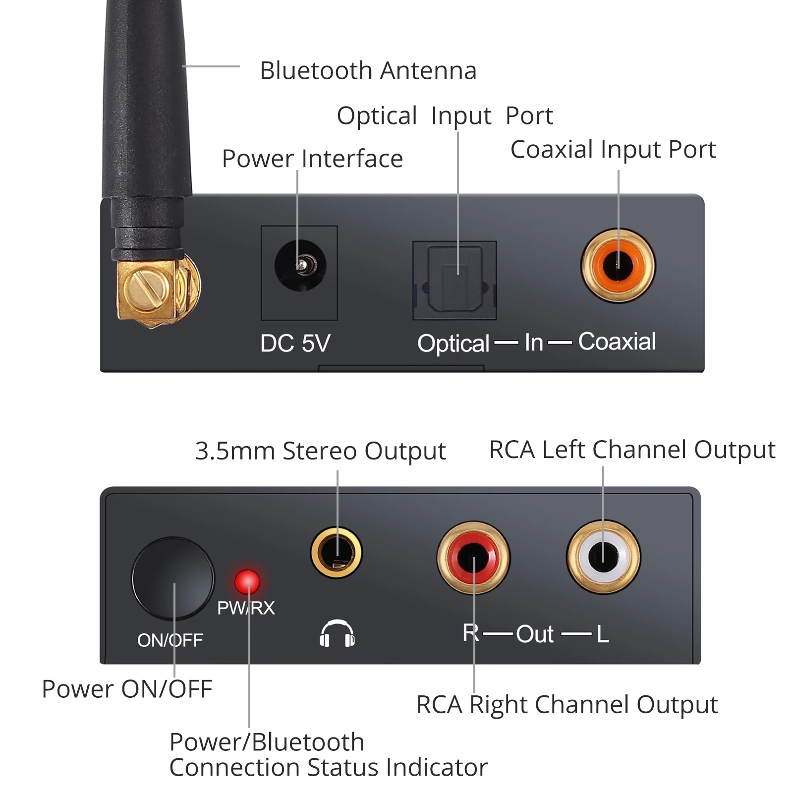 Этот продукт может преобразовывать оптические, коаксиальные и bluetooth-совместимые цифровые аудиосигналы в стерео аналоговые аудиосигналы, которые подключены к усилителю. Помогите пользователям решить проблему подключения различных аудиоинтерфейсов к аналоговым усилителям. Этот продукт очень подходит для домашнего кинотеатра, обучения, структуры обучения, конференц-залов, магазинов приборов и других мест.