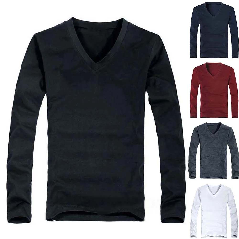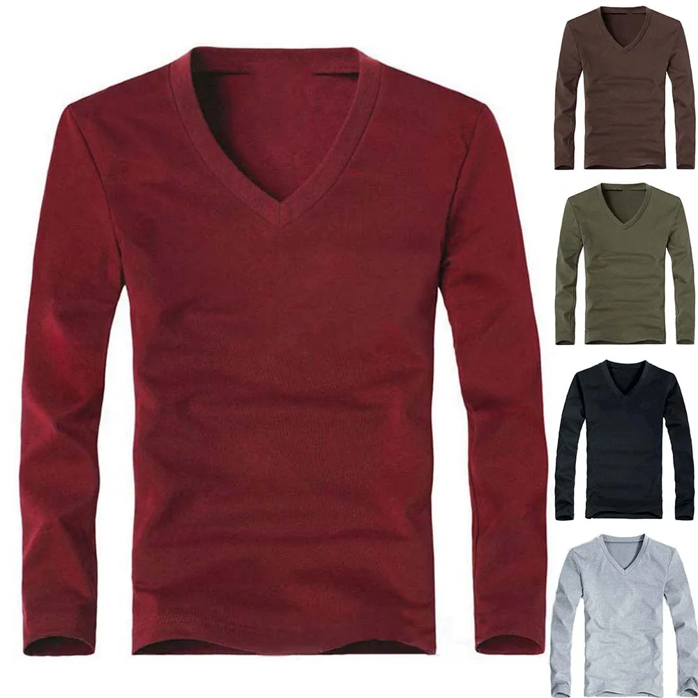 Повседневная мужская твердая Цвет с V образным вырезом и длинным рукавом, свитер-пуловер из хлопчатобумажной ткани размера плюс, обтягивающая кофта