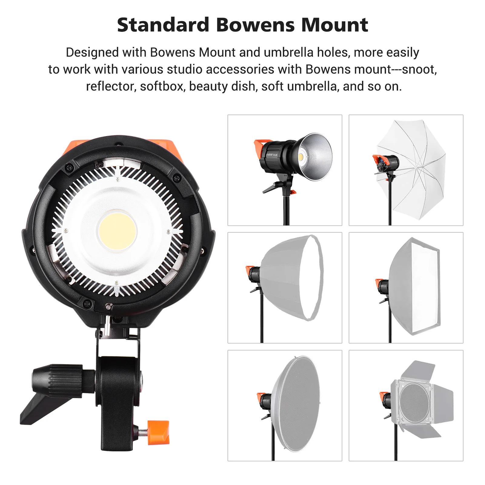 Стандартное Крепление Bowens:Разработан с креплением Bowens и отверстиями для зонтов, более легко работать с различными студийными аксессуарами с креплением Bowens --- snoot, reflector, softbox, beauty dish, soft umbrella и так далее.