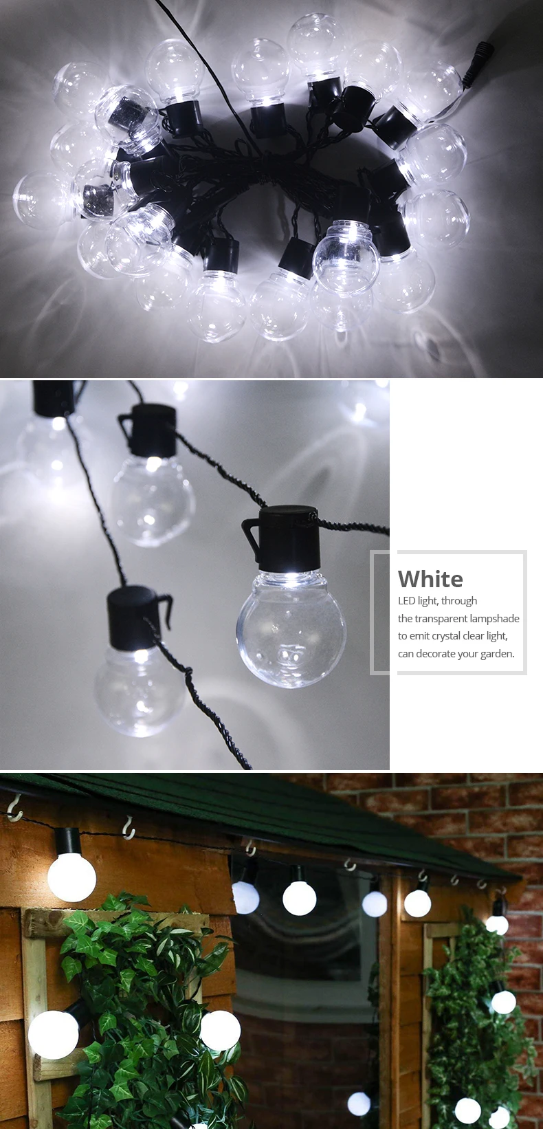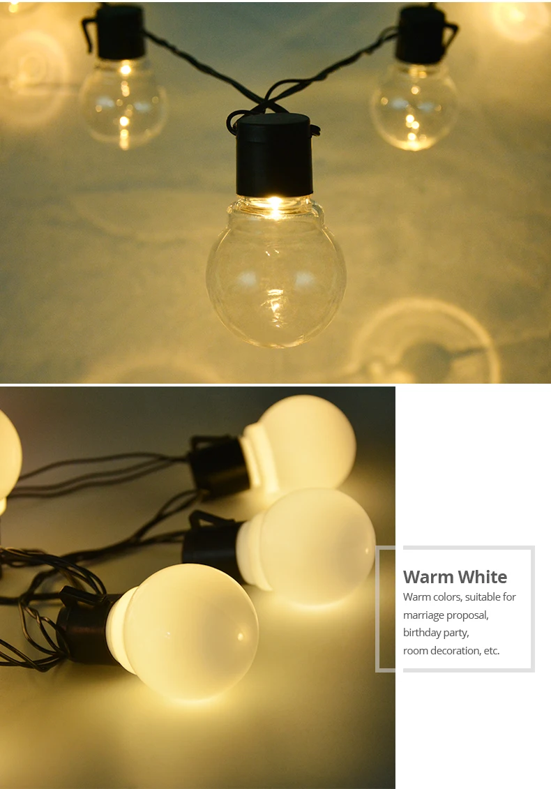 Оснащенный 20 глобальных светильник ламп на 5 м, эта строка светильник издает ярко-желтое свечение на задних дворов, беседок, садов, пергол, палуб, городских крыш, держащих букет невесты на свадьбе, званых обедов, вечеринок по случаю Дня рождения, посиделки мгновенно приподнимают светильник в романтическом, но праздничном стиле.