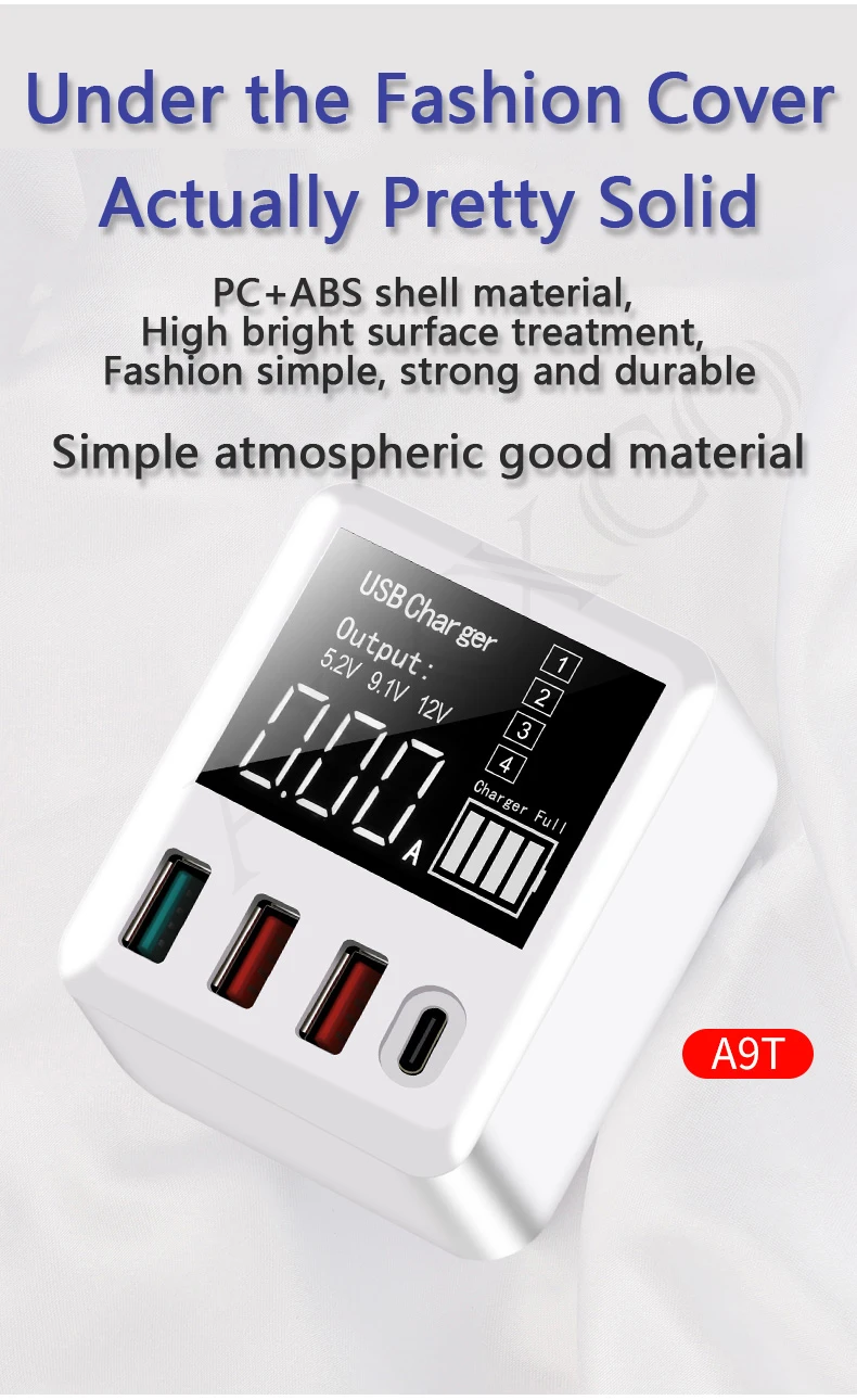Product parameters: A9T Input voltage: AC100-240V 50-60Hz DC output: 5V/6A Total power: 30W Type-C output: 5V/3A QC3.0 output: 5V3.4A/9V2A/12V1.5A Automatic recognition: adaptive voltage and current Cooling method: safe cooling aluminum sheet A9T+ Input voltage: AC100-240V 50-60Hz DC output: 5V/8A total power: 40W USB output: 5V1-2.4A PD output: 5V3A/9V2A/12V1.5A QC3.0 output: 5V3A/9V2A/12V1.5A Automatic recognition: adaptive voltage and current Cooling method: safe cooling aluminum sheet