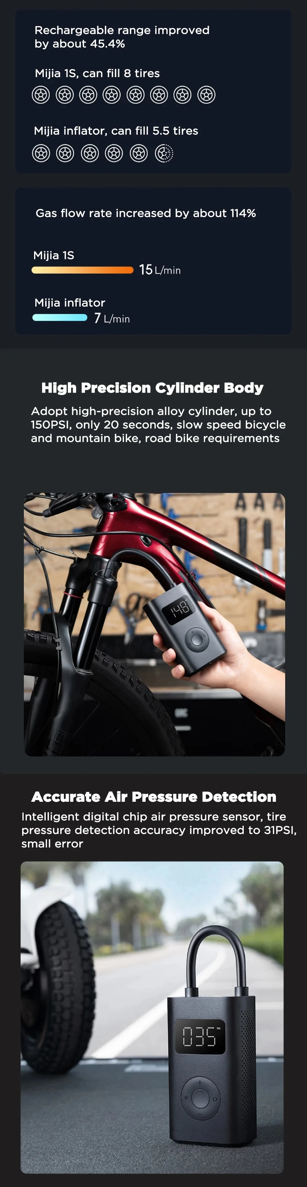 ★The air pressure sensor upgraded to a digital chip, the tire pressure detection accuracy is increased to ±1psi*, the error is smaller, there is no need to rely on the foot to repeatedly check whether it is full.