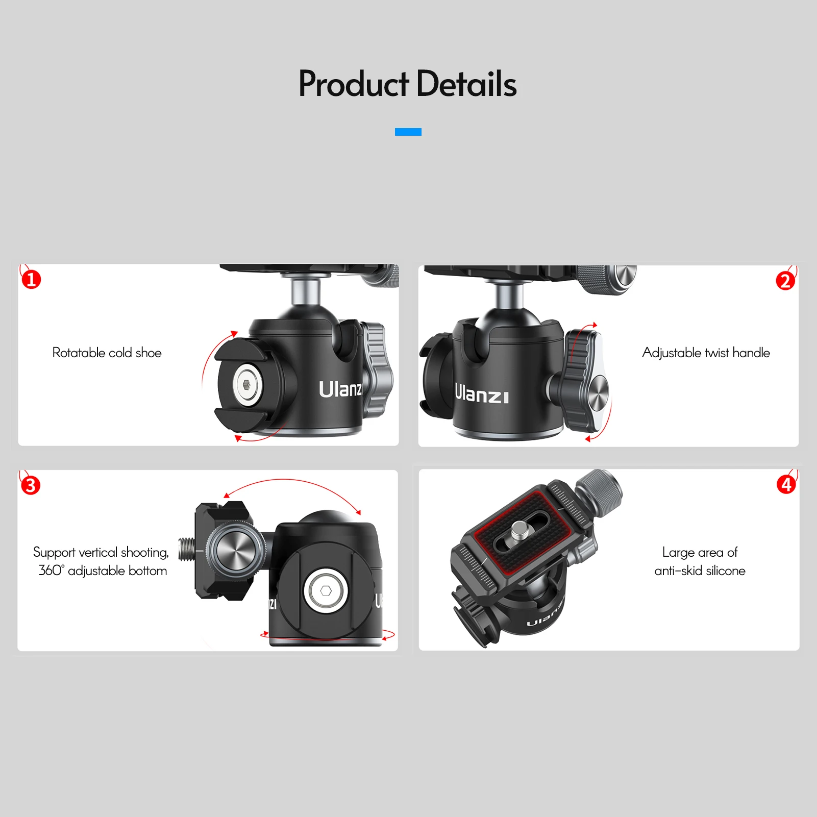 С u-образной зазубриной, шаровая Головка может быстро переключаться между вертикальной съемкой и горизонтальной съемкой. Его основание в форме диска может достигать панорамирования 360 ° для панорамной фотографии.