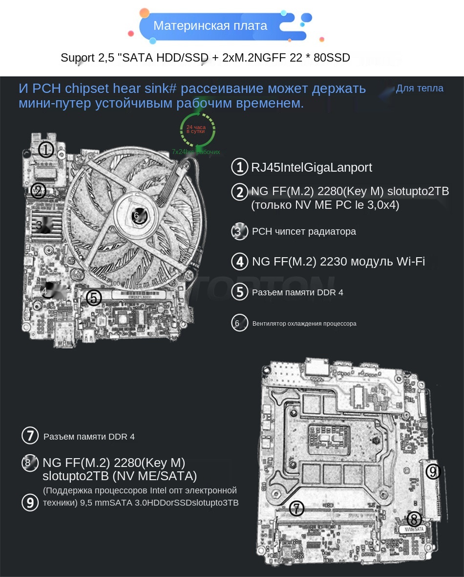-Поддержка 2 * M.2 2280 NVME/PCIE3.0x4 SSD + 1*2,5 ''SATA HDD/SSD.