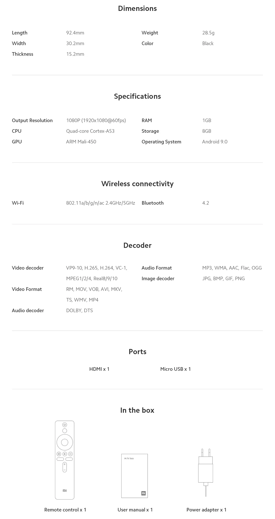 Размеры: 92,4*30,2*15,2 ммРазрешение на выходе: 1080P(1920x1080 @ 60fps)Процессор: четырехъядерный CotexA53Графический процессор: ARM Mali-450Оперативная память: 1 ГбПЗУ: 8 ГбBluetooth: BT4.2Wi-Fi: 802,11 a/b/g/n/ac 2,4 ГГц/5 ГГцВидео декодер: VP9-10, H.265, H.264, VC-1, MPEG1/2/4, real 8/9/10Xiaomi Mi TV Stick поток где угодно