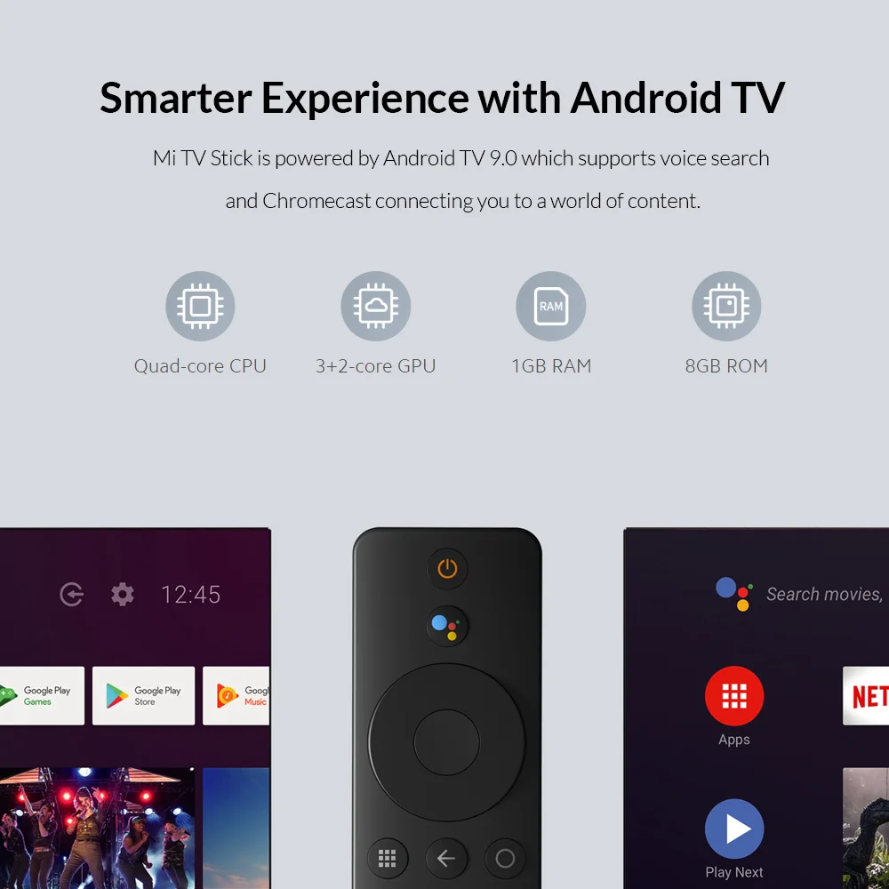 Mi TV Stick работает от Android TV 9,0, который поддерживает голосовой поиск и Chromecast и подключает вас к миру контента. Догоняйте любимые сериалы, Играйте в игры, смотрите новости или переключайтесь на радио. Mi TV Stick также рекомендует видео на основе ваших личных предпочтений Youtube и Google Play!