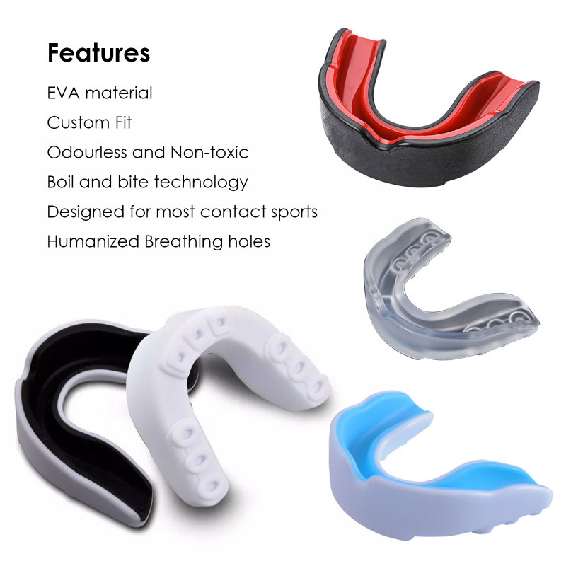 2. Маска изготовлена из пищевой эва; Чрезвычайно прочный, мягкий и гибкий синтетический материал предназначен для того, чтобы выдерживать воздействие и защищать зубы и десны от травм во время тренировок или соревнований.