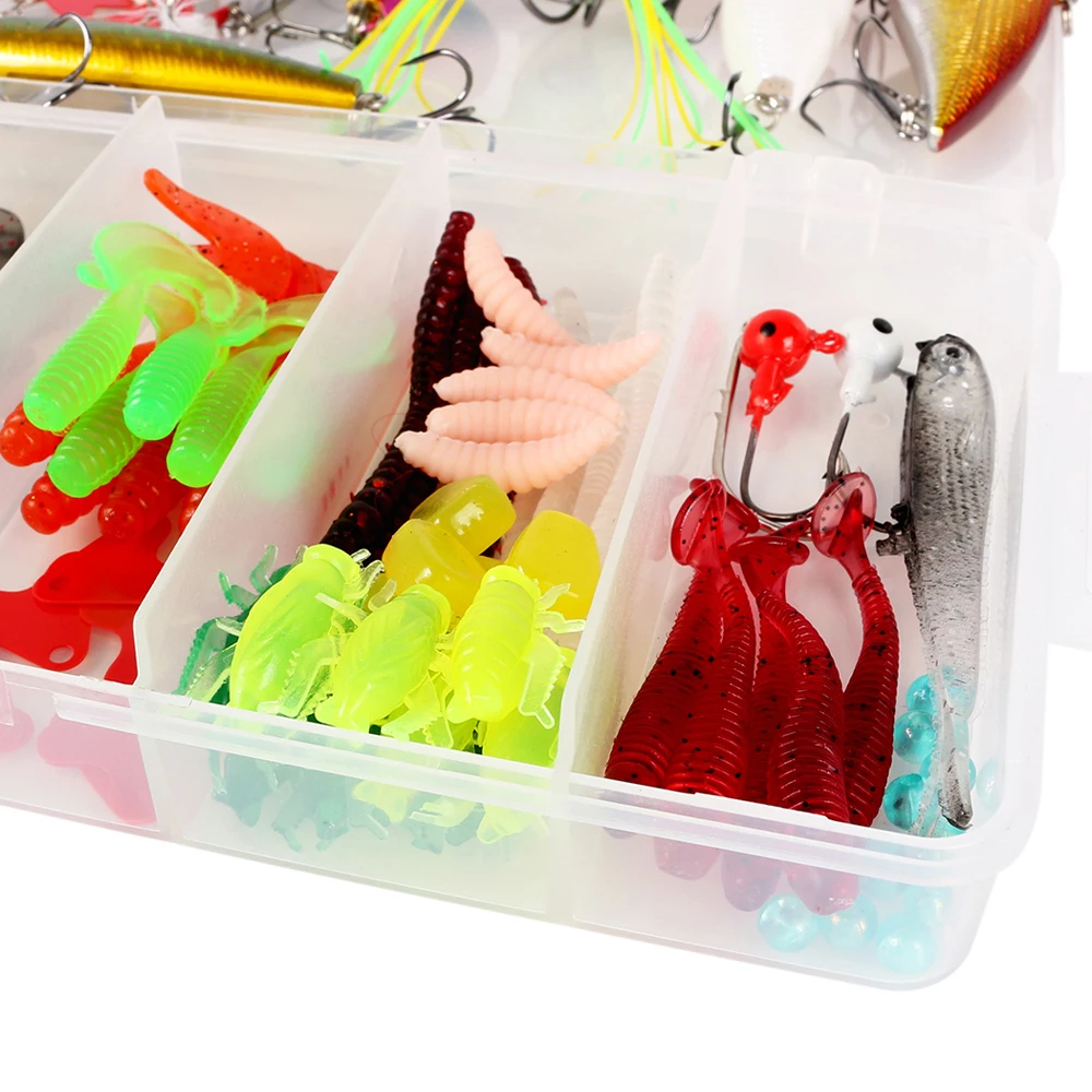 102 шт. набор рыболовных приманок собирает почти все рыболовные аксессуары, включая приманки, крючки, джиг-головку, гири, вертлюги, разделенные кольца, ящик для снастей.