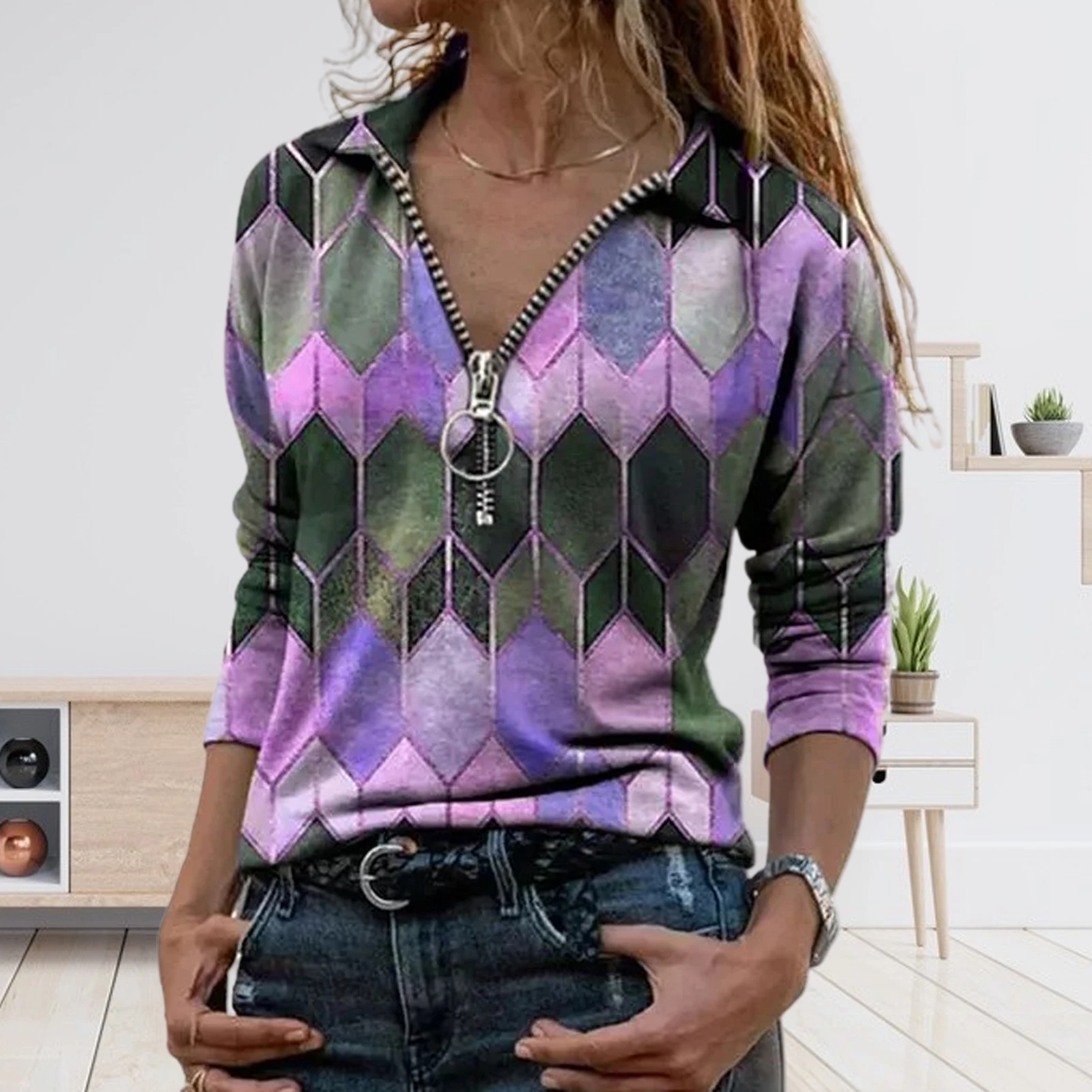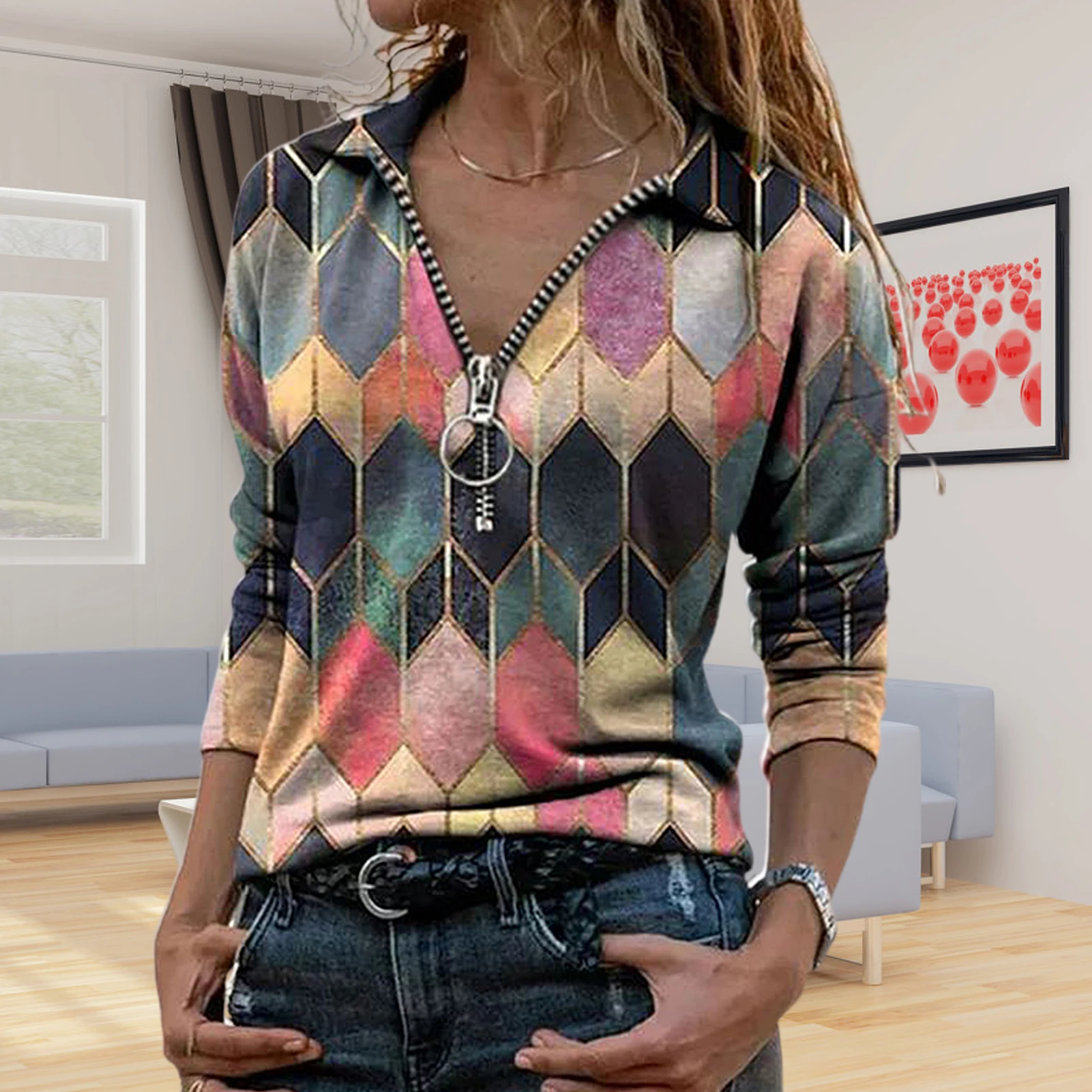 Женская Ретро футболка с длинным рукавом на молнии с v-образным вырезом и геометрическим принтом в виде шестиугольника