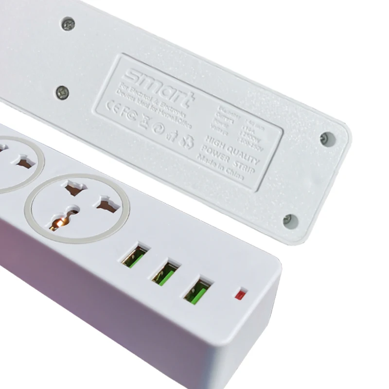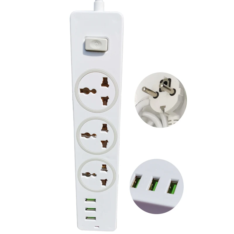 1. Тип вилки: европейская вилка 2. Номинальное напряжение: 100-250 В 3. Номинальный ток: 10А (макс.) 4. Номинальная мощность: 2500 Вт 5. Частота переменного тока: 50-60 Гц 6. Socket_Outlets: 3 розетки 7. USB порт: 3 портами USB (5V-1.5A) (Авто макс) 7,5 W 8. Длина шнура: 2 метра