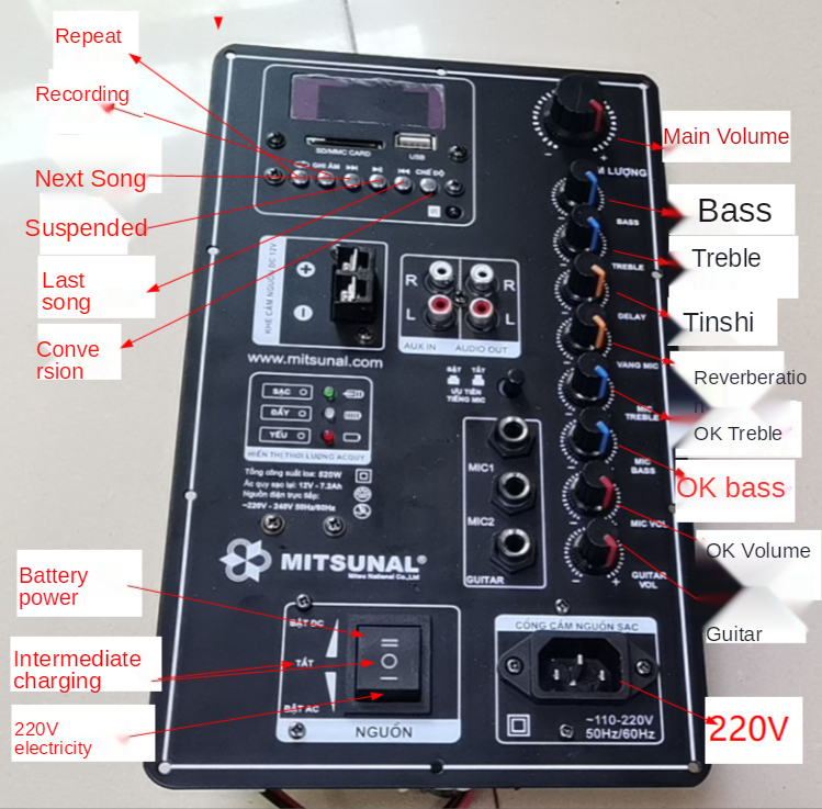 3. Настройки управления питанием: громкость музыки, высокие частоты, управление басами; Проводные настройки микрофона: громкость, высокие частоты, бас, задержка, управление реверберами; Регулятор громкости гитары: регулятор громкости гитары