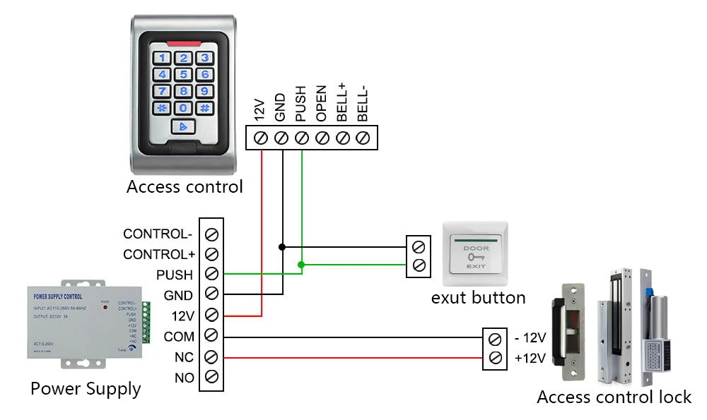 Посылка включает в себя: контроль доступа + блок питания + Электрический замок + кронштейн U + кнопка выхода + 10 шт брелок